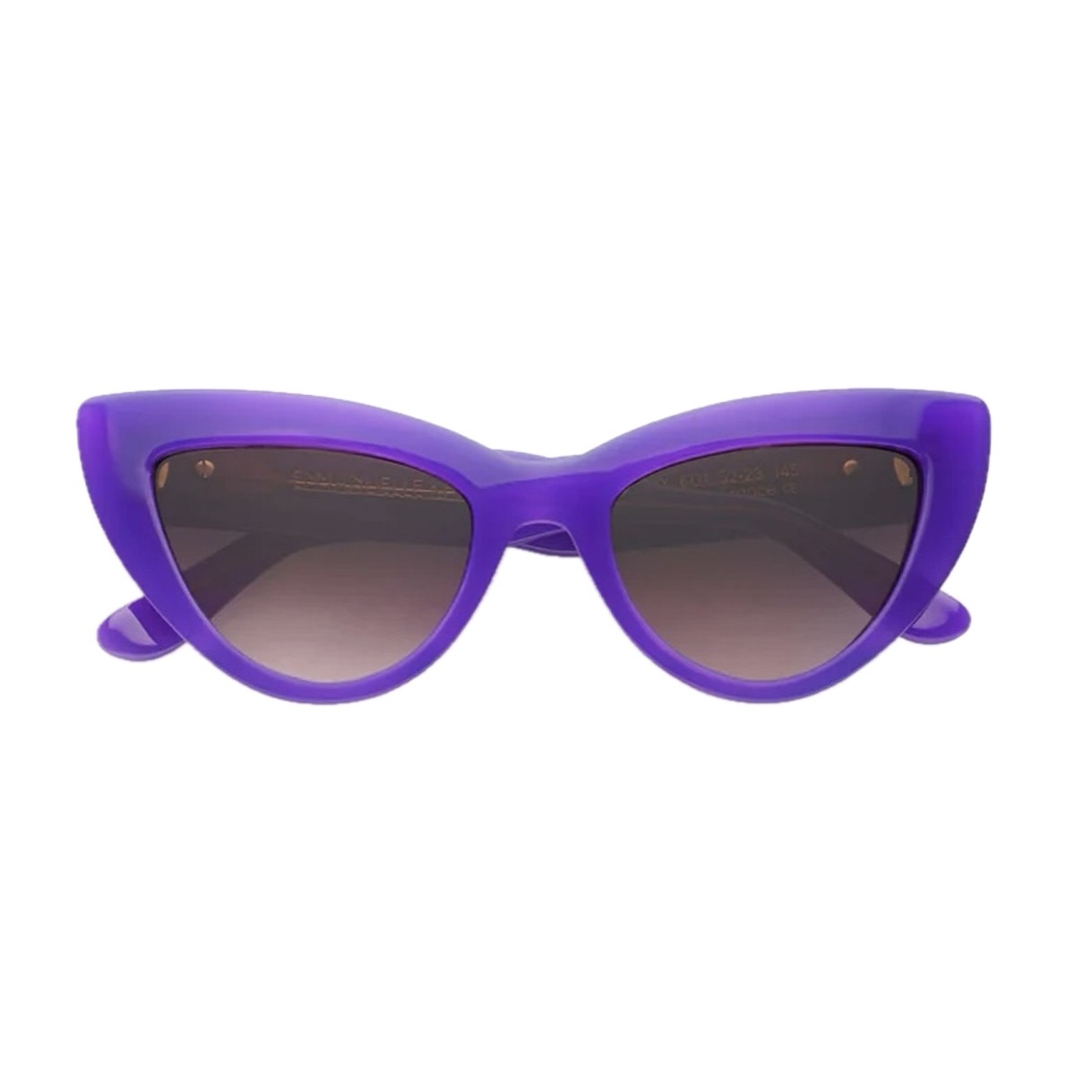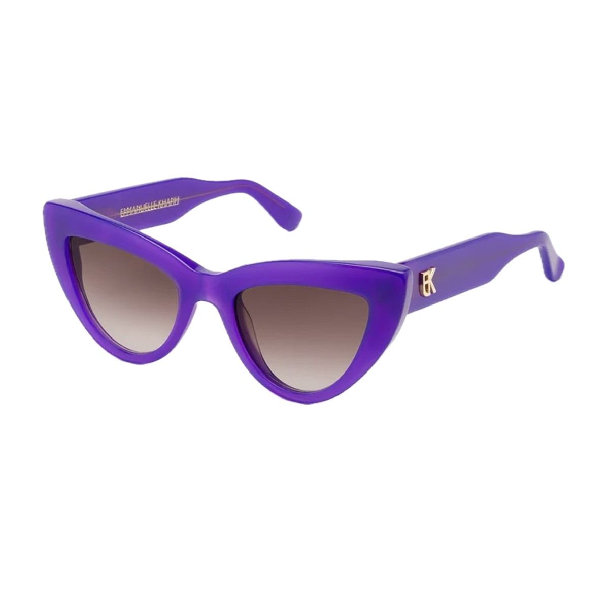 Emmanuelle Khanh frames embody Parisian elegance with bold, timeless lines, transforming every gaze into an icon of style. The Cherry sunglasses model is a tribute to French glamour with a contemporary twist. The frame reinterprets the iconic cat-eye style with a bold, sophisticated design, made unique by inner bevels that add depth and character. Crafted from fine vibrant purple acetate and meticulously handmade in France, it reflects the Maison’s excellence in every detail. The design is completed by softly shaded brown lenses and temples embellished with a 3D EK logo patch, a signature detail that enhances the frame with exclusive elegance.