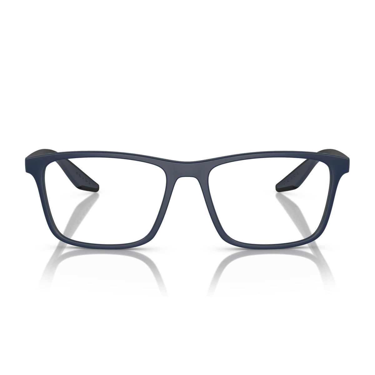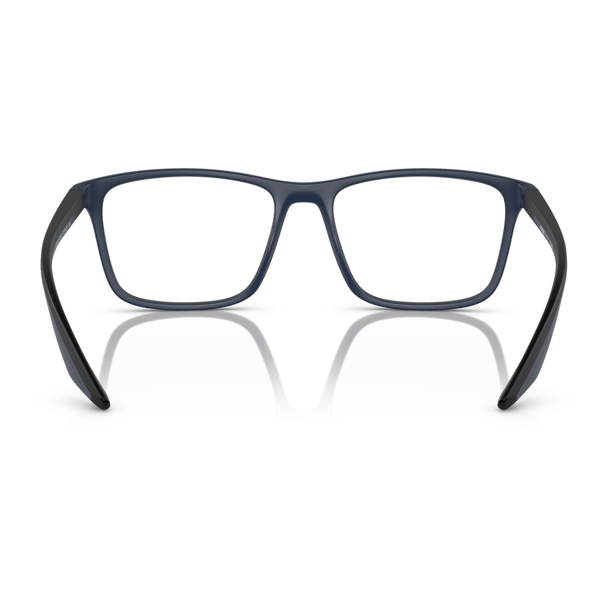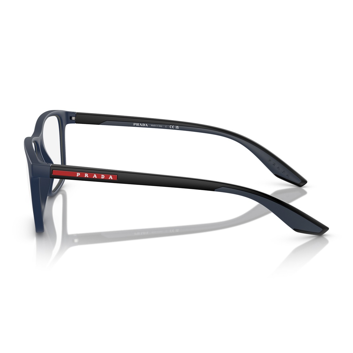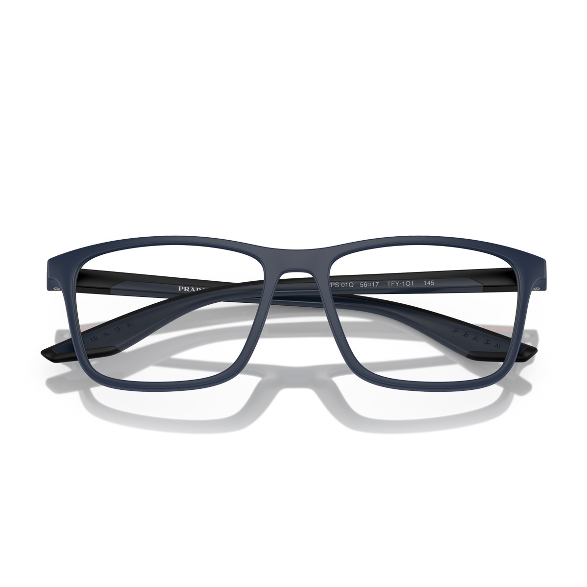 The PS 01QV optical model from the Prada Linea Rossa collection combines practicality and elegance while conveying a dynamic spirit. The nylon frame, featuring a distinctive blue rubber finish, has a rectangular shape and is equipped with flexible hinges for a lightweight, comfortable, and easy-to-wear design. The temples are embellished with the iconic Prada Linea Rossa logo.