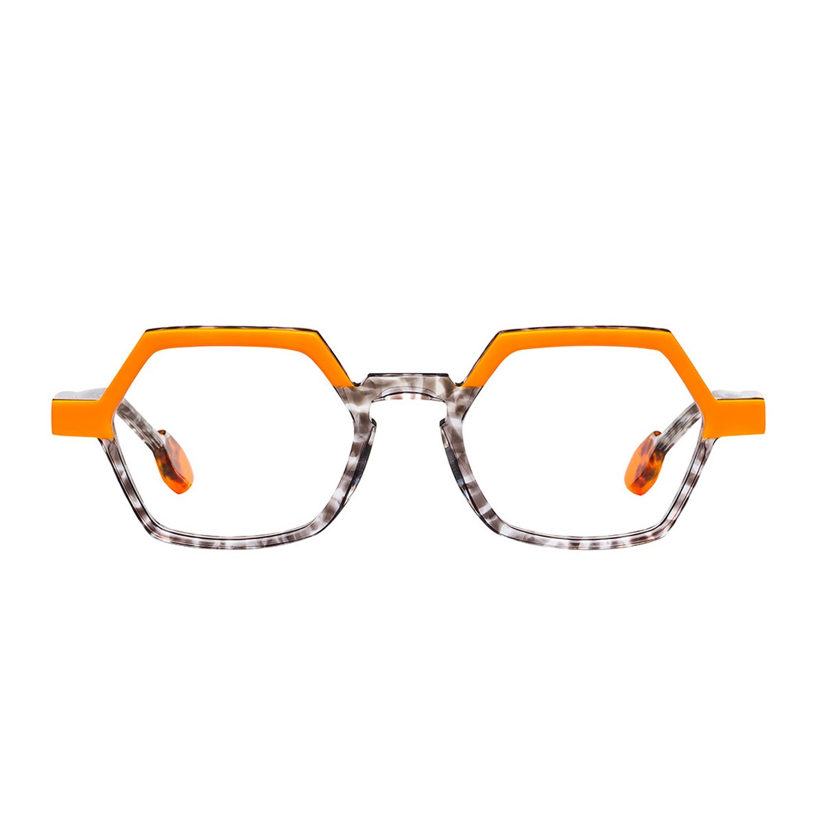 The Cantedi optical model by Matttew, a Belgian brand founded by Matthieu Duchêne and renowned for its handcrafted frames made in France, combines creativity and high quality in a design with strong visual impact.The two-tone acetate frame, with a vibrant orange upper front and a transparent crystal grey lower section, stands out for its bold geometric shape that enhances facial features with originality. The transparent grey temples with orange end tips echo the front design, ensuring lightness, comfort, and stylistic harmony.
