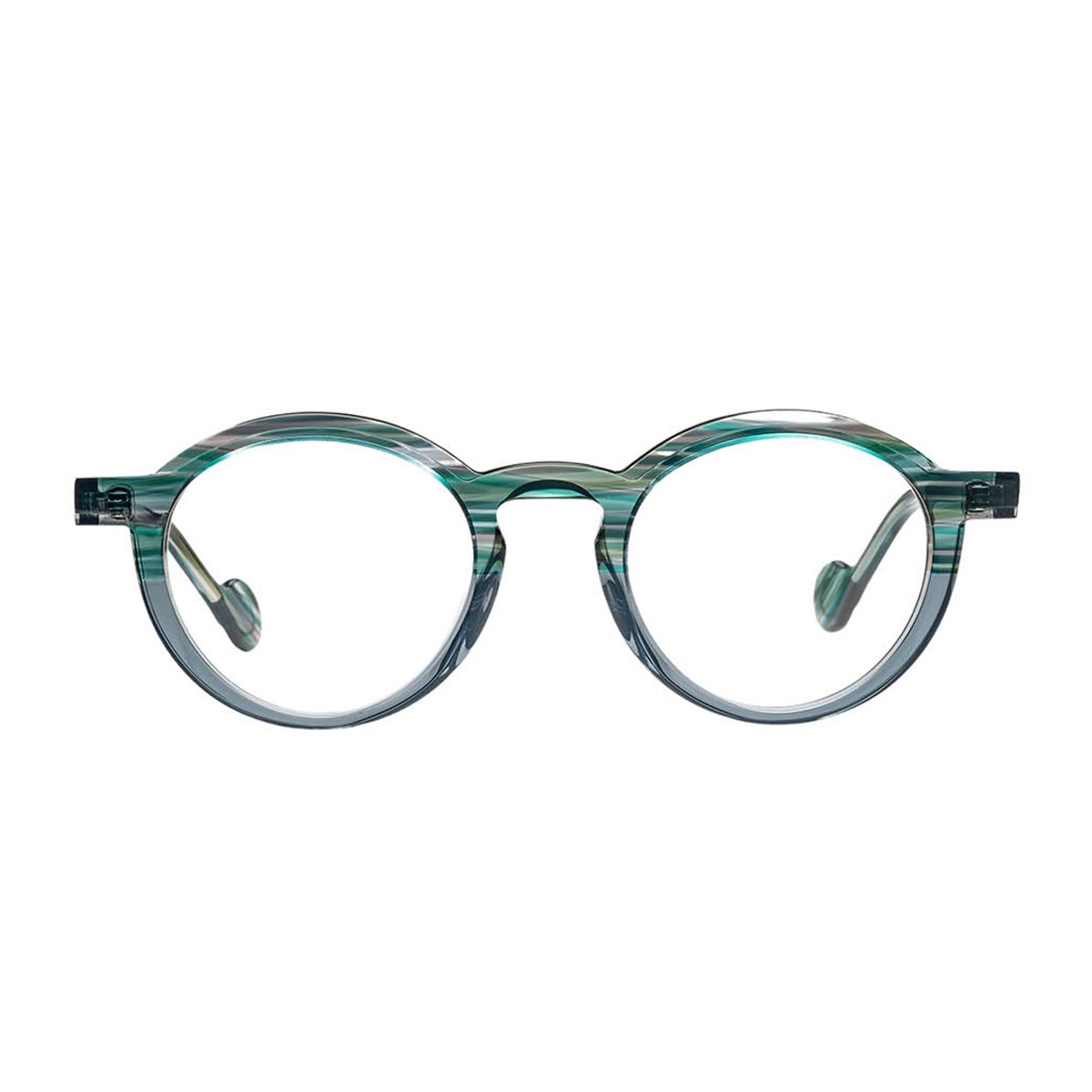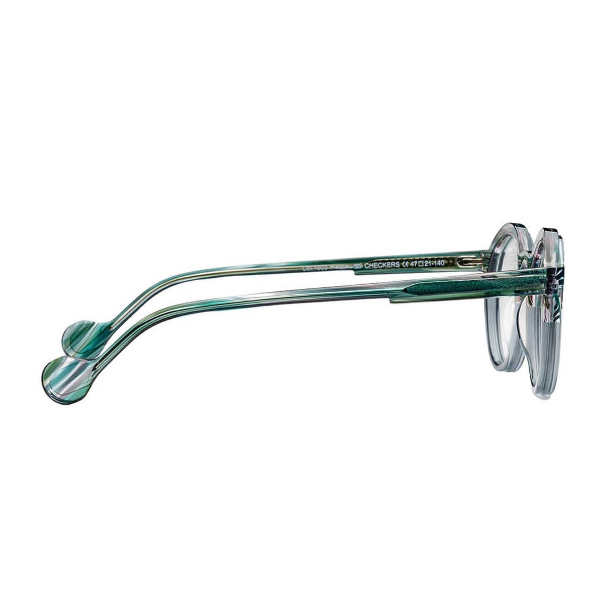 The Checkers optical model by Matttew, a Belgian brand founded by Matthieu Duchêne and renowned for its handcrafted frames made in France, represents the perfect balance between creativity and quality.The acetate frame with green and crystal grey shades captivates with its elegant graphic effect and softened round shape, designed to harmonize facial features while maintaining character and personality. The slim temples with rounded end tips, coordinated with the front, ensure lightness and comfort, making it ideal for everyday wear.