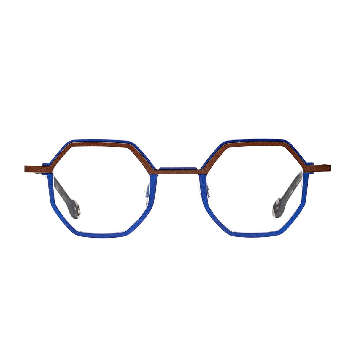 The Doyenne model by Matttew, a Belgian brand founded by Matthieu Duchêne and renowned for its handcrafted frames made in France, is the perfect choice for those who want to stand out with a bold yet refined look. The ultra-lightweight titanium frame is defined by its geometric octagonal shape, combining originality and elegance in a contemporary design. The two-tone blue and brown front creates a sophisticated contrast, enhanced by the slim temples with black and grey tortoiseshell acetate tips, adding a touch of refined personality.