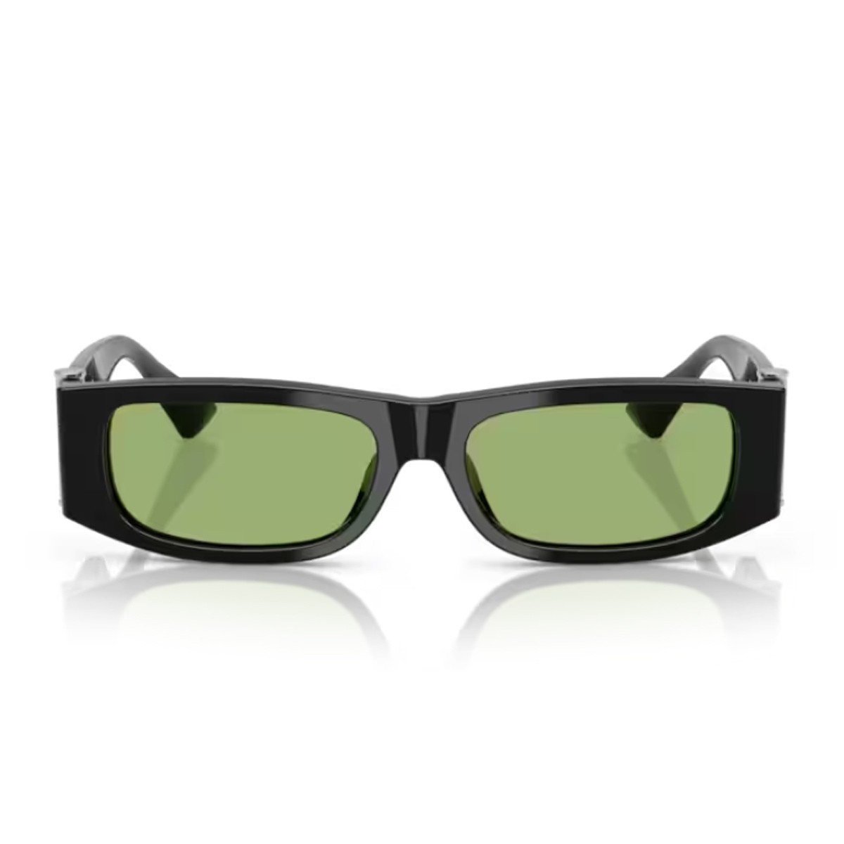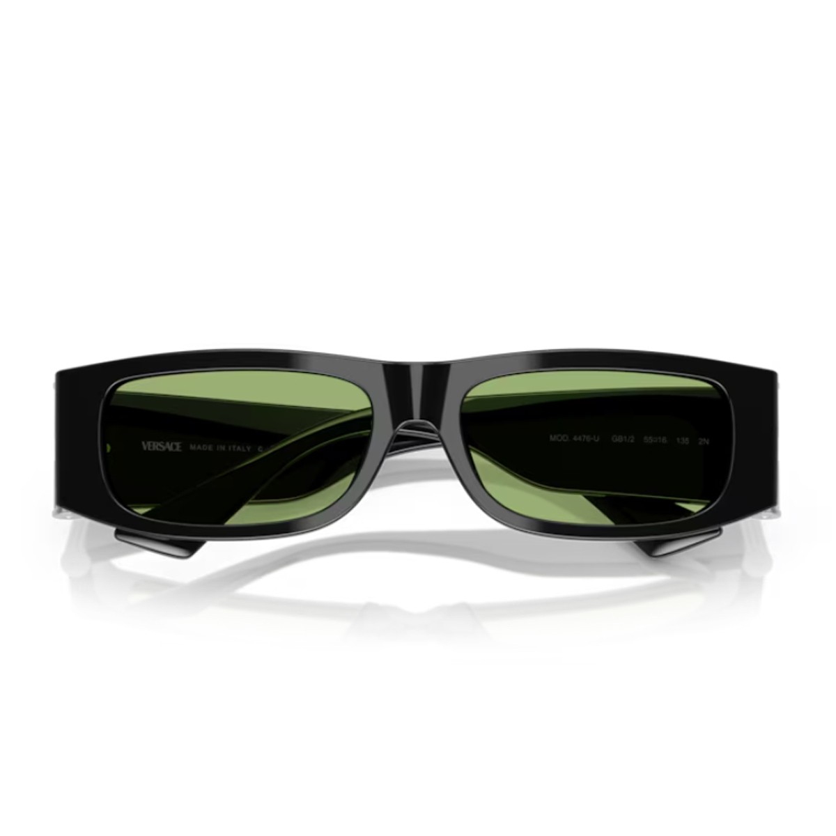 The new Versace 0VE4476U sunglasses, part of the “Medusa Glam” line, blend clean lines and iconic details in a sophisticated, modern design. Featuring a compact, rectangular profile, the model is crafted entirely from black acetate and paired with green-toned lenses. The temples are adorned with a Medusa stud and an elegant silver-tone column detail—signature elements of Versace’s style that add a refined and bold touch to the overall look.