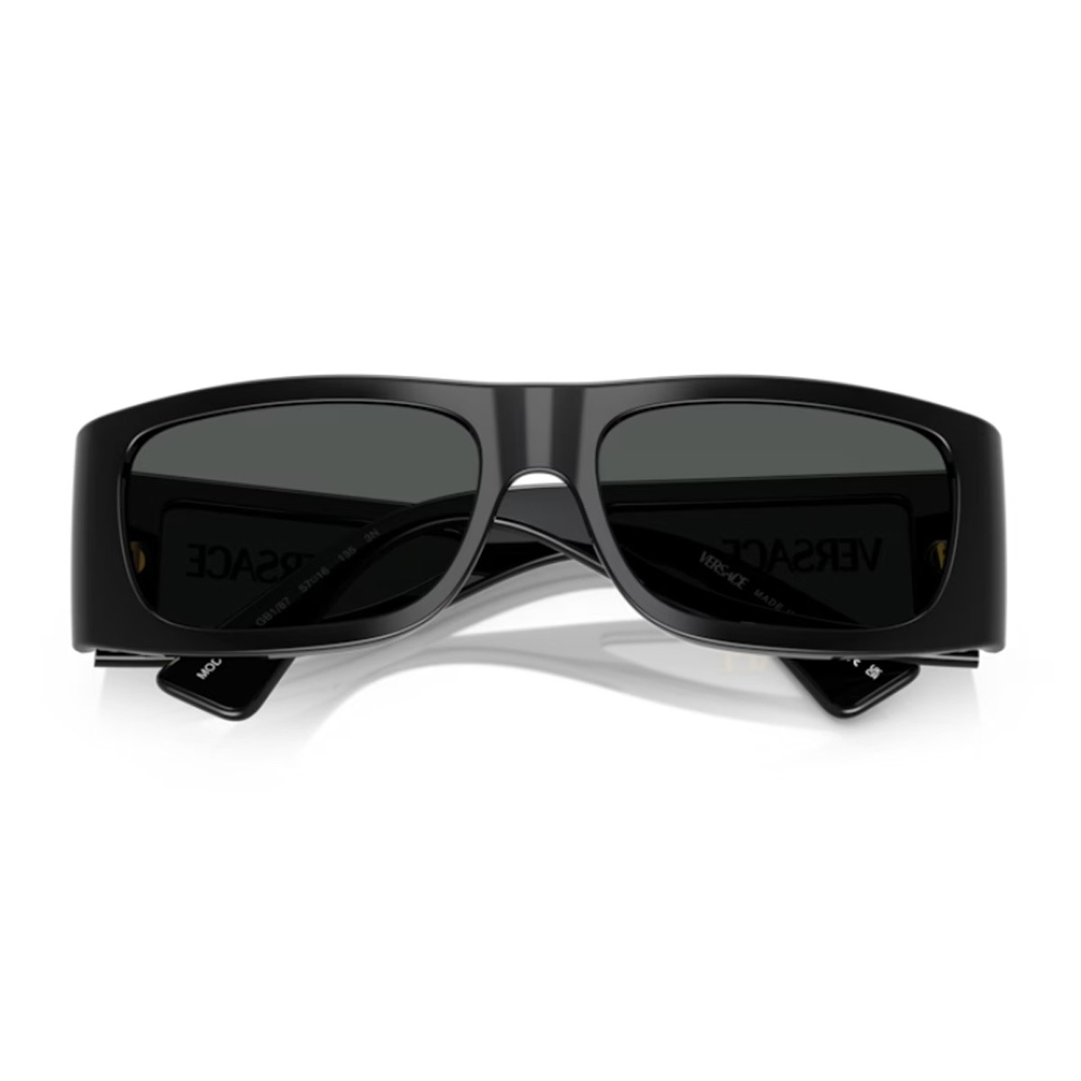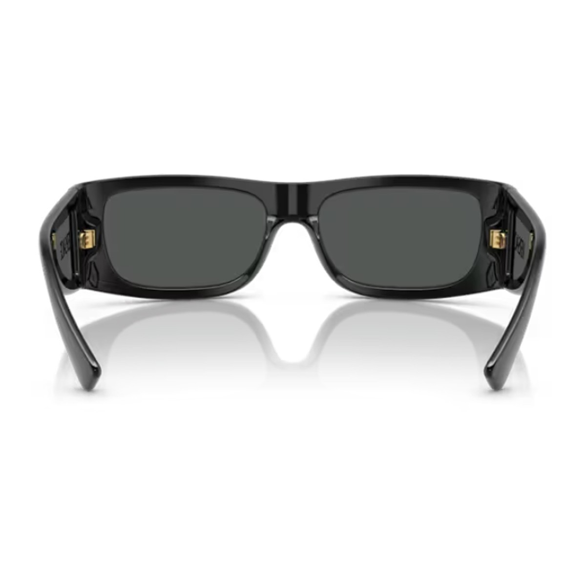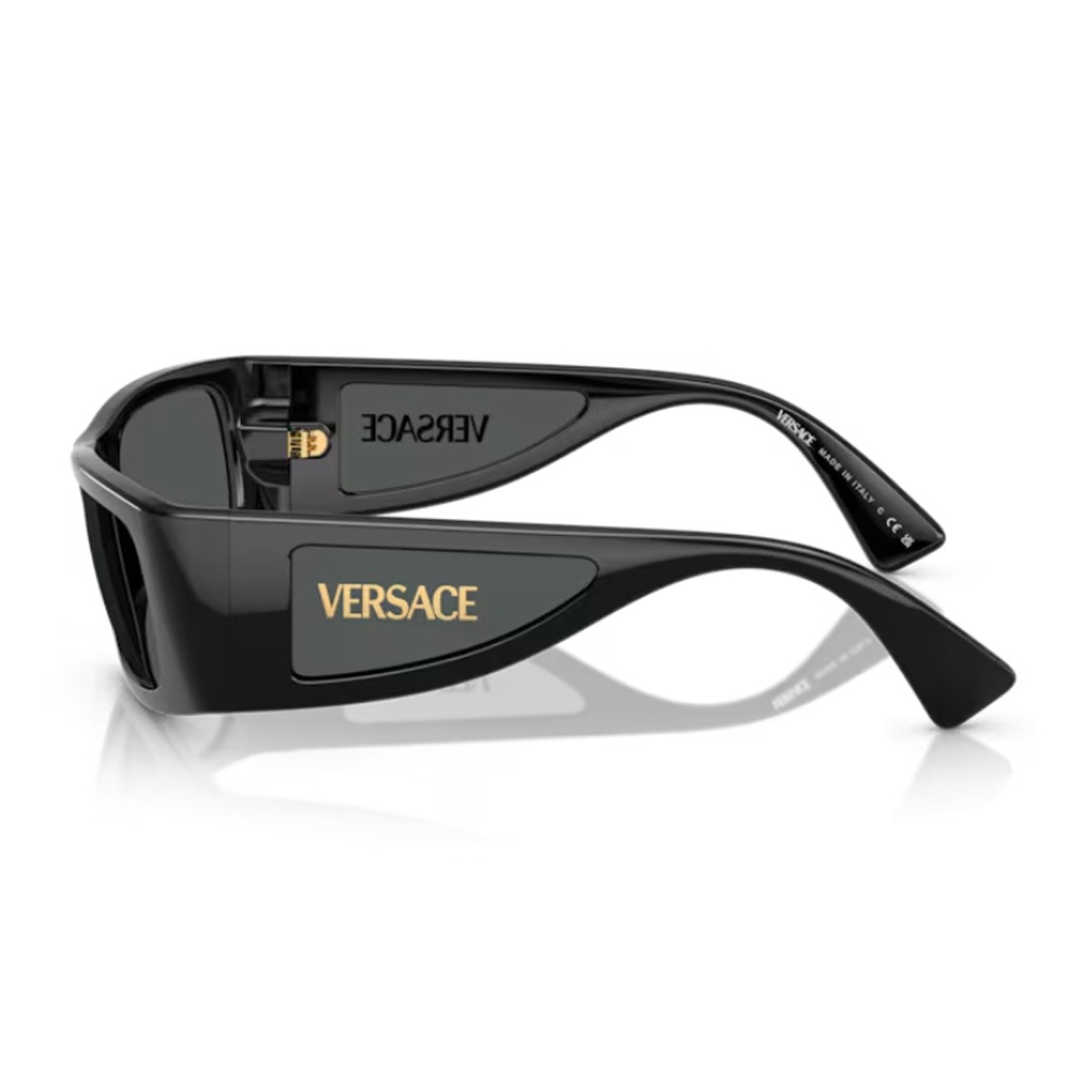 The new Versace 0VE4482 “Lens Logo” sunglasses are a bold men’s model designed for those who aren’t afraid to stand out. The black injected frame features a dynamic design with strong lines and a rectangular shape softened by rounded edges. The wide temples are enhanced with dark grey lens inserts, highlighted by silver-tone metal Versace lettering, adding a daring and contemporary touch.