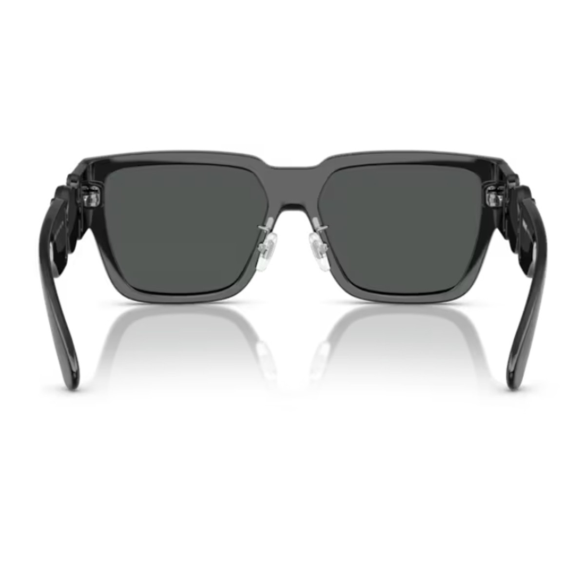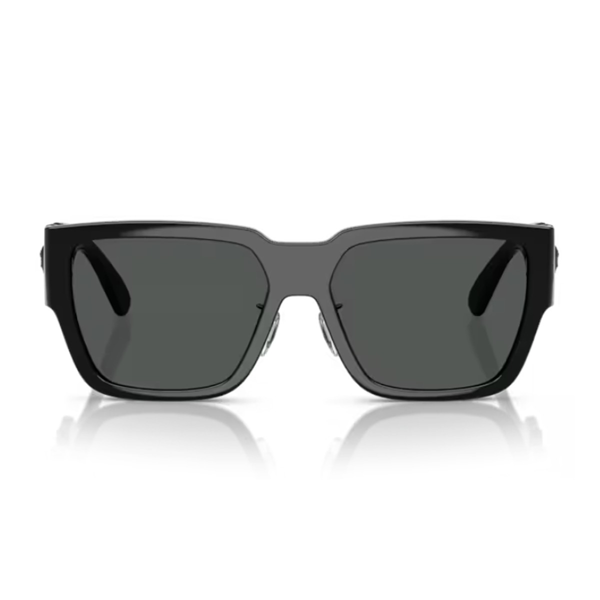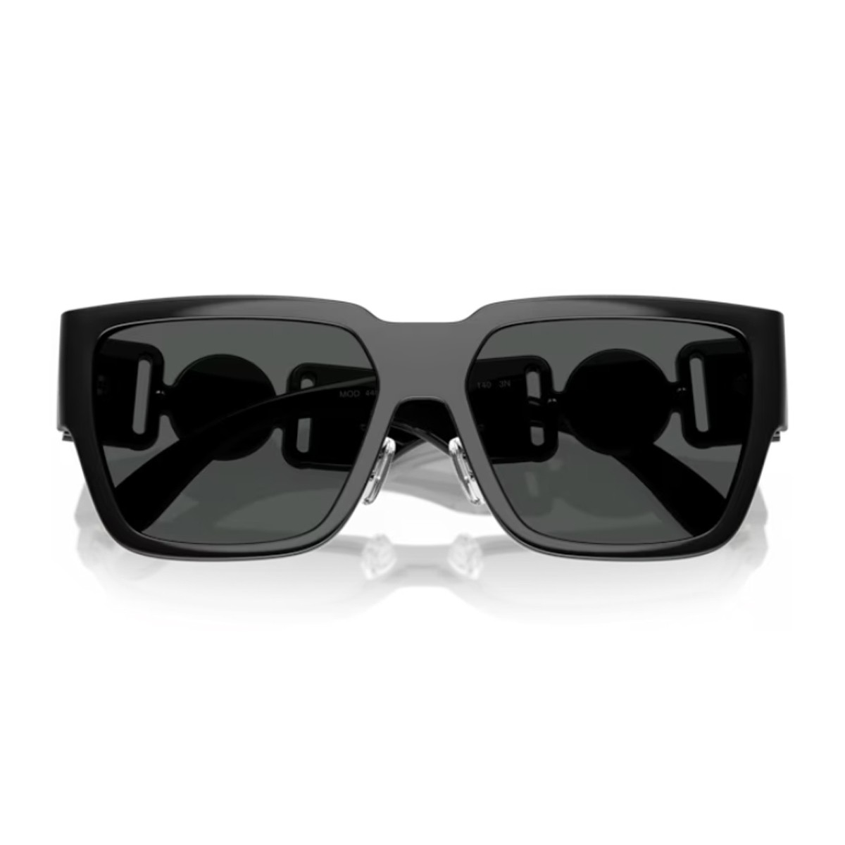 The new Versace 0VE4483D sunglasses make a bold style statement, featuring original decorations inspired by the best-selling Biggie. The black injected frame showcases an oversized square shape, paired with lenses in a sophisticated dark grey tone. The temples are adorned with iconic black metal Medusa head plaques on the front, enhancing the model’s strong and distinctive design.