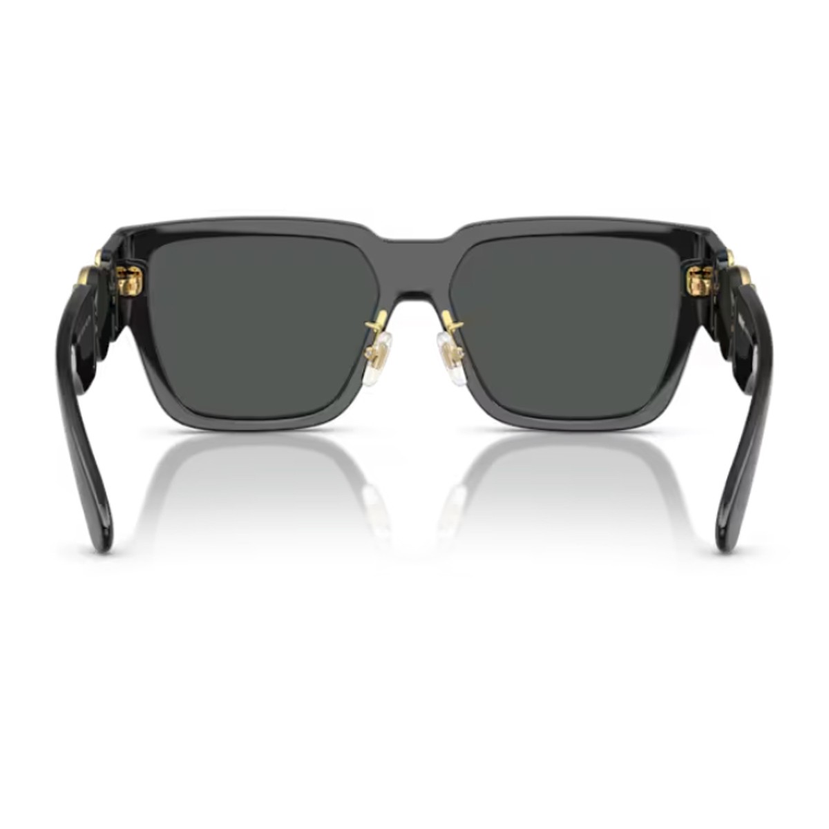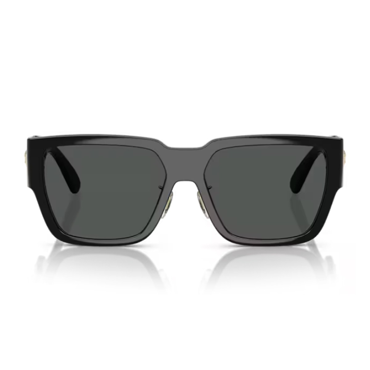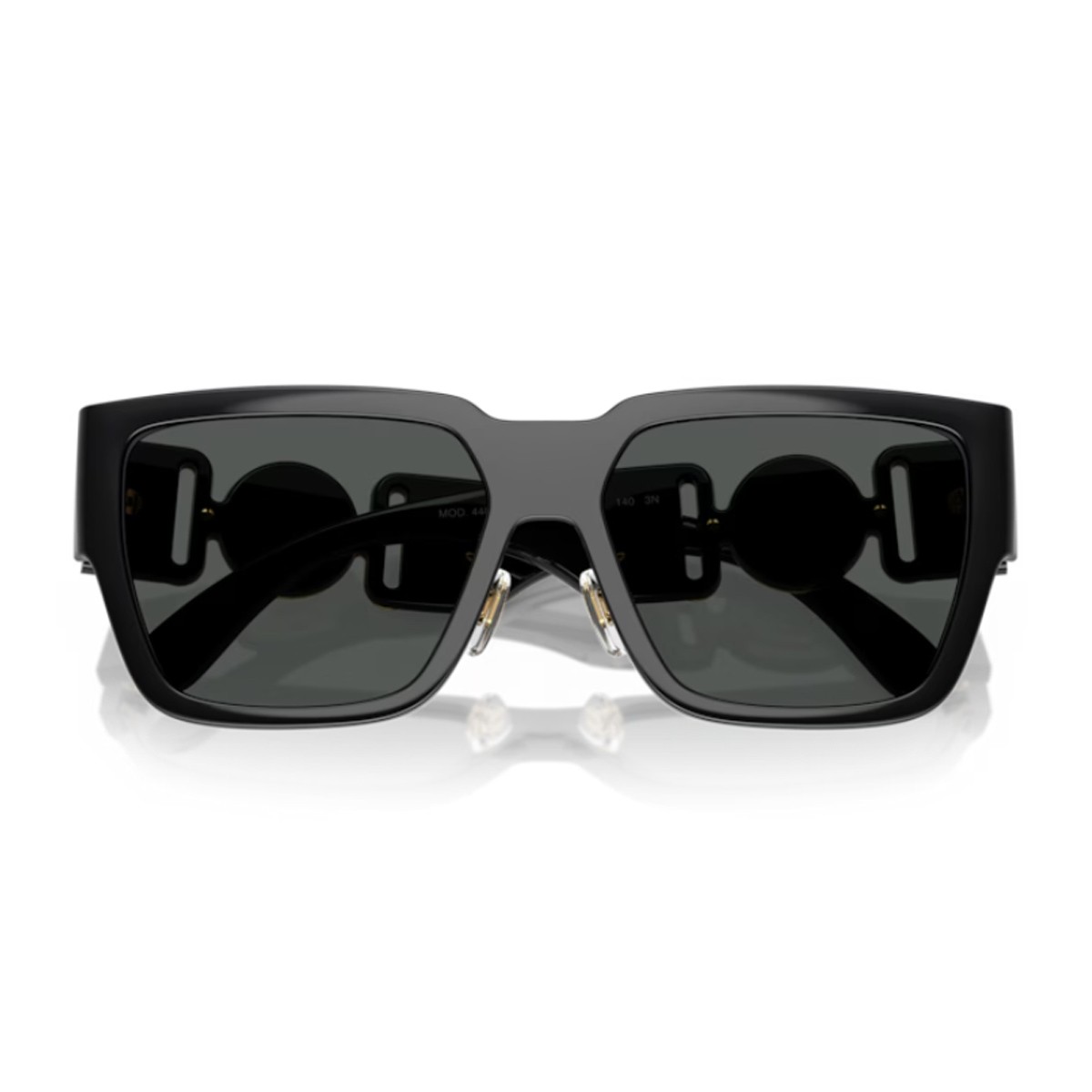 The new Versace 0VE4483D sunglasses make a bold style statement, featuring original decorations inspired by the best-selling Biggie. The black injected frame showcases an oversized square shape, paired with lenses in a sophisticated dark grey tone. The temples are adorned with iconic gold-tone metal Medusa head plaques on the front, enhancing the model’s strong and distinctive design.