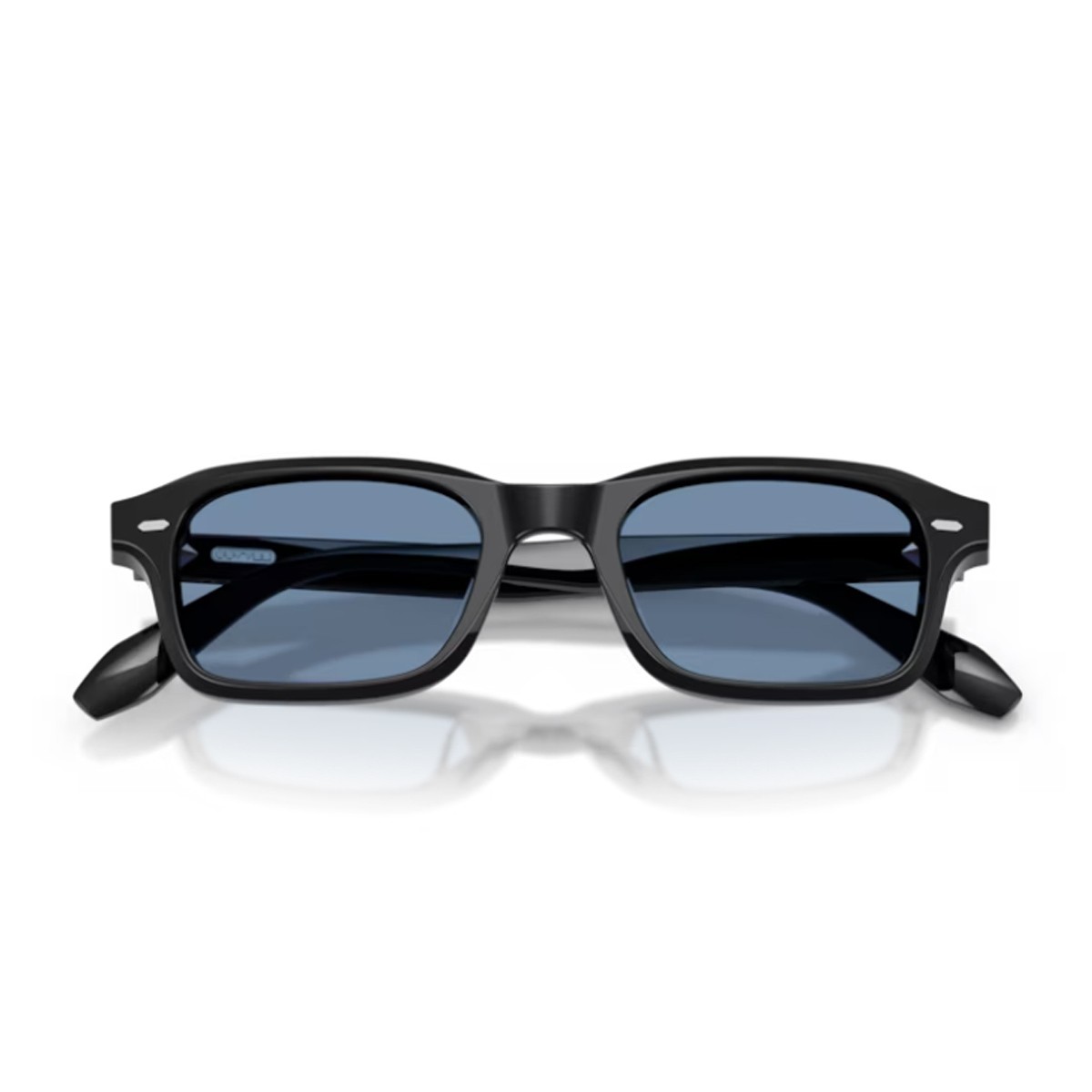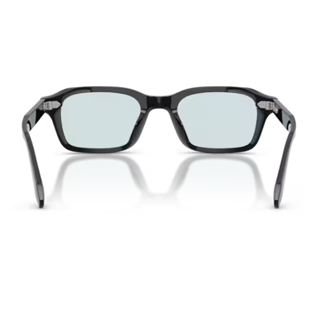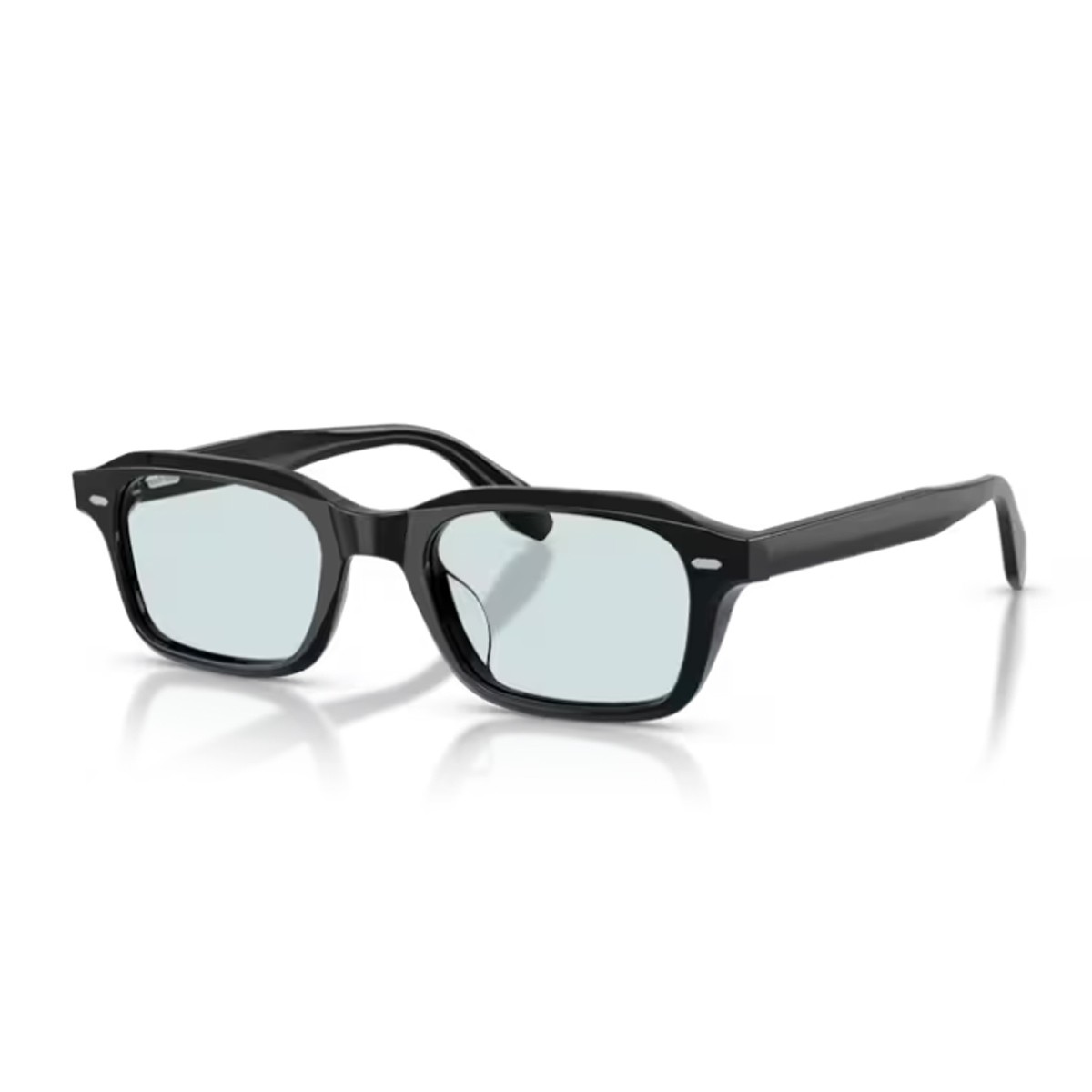 The new Oliver Peoples OV5588SU – N.08 model, inspired by an archival frame and reinterpreted with a contemporary twist, blends vintage charm with modern style.The rectangular black acetate frame, enhanced by a custom metal plaque on the front, exudes both elegance and character.The blue photochromic glass lenses, with retro-inspired hues, complete the design: clear indoors and darker in sunlight, for a sophisticated look and optimal protection in any setting.