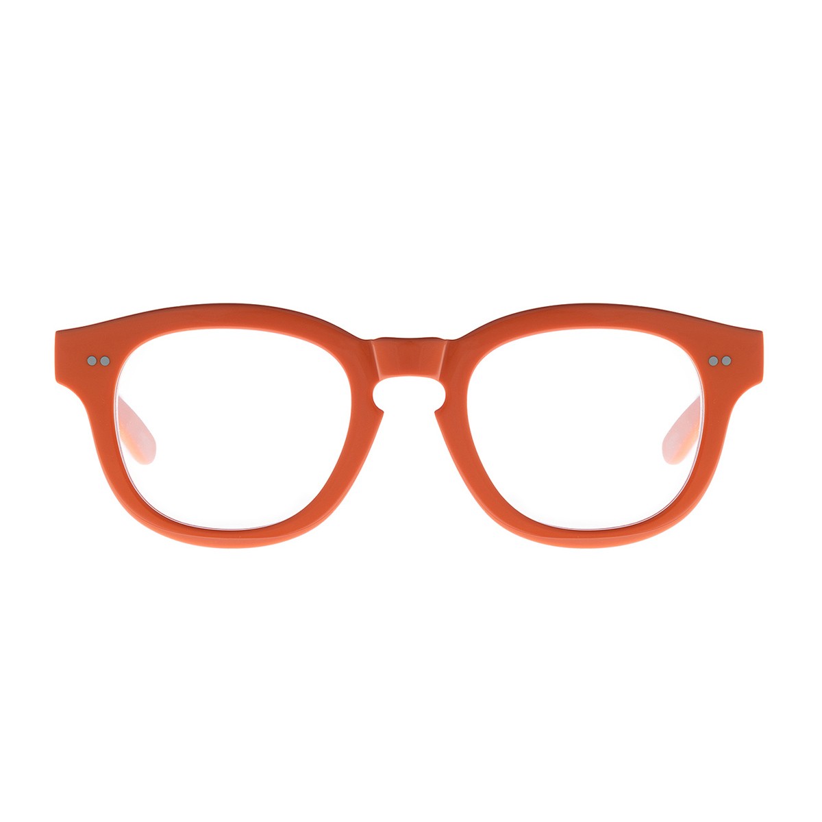 Costantino Toffoli is an Italian company that produces handcrafted eyewear made from cellulose acetate, combining advanced technology with traditional craftsmanship. Founded in the 1990s in the Cadore eyewear district, it offers collections ranging from classic to vintage models, featuring a distinctive style and refined details.The T070 model is a bold and distinctive eyewear piece, featuring a phantos shape with defined profiles. The solid orange acetate frame gives it a vibrant and modern look, enhanced by metal rivets that add a touch of artisanal refinement.