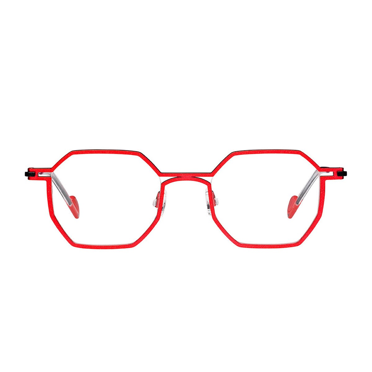 The Cobalt optical model by Matttew, the Belgian brand founded by Matthieu Duchêne and renowned for its handcrafted frames made in France, is a bold and contemporary style statement. The ultra-lightweight titanium frame in vibrant red stands out with its geometric octagonal shape, blending innovation, originality, and sophistication. Slim black steel temples with red tips add lightness and stability, ensuring impeccable comfort even during prolonged daily wear.
