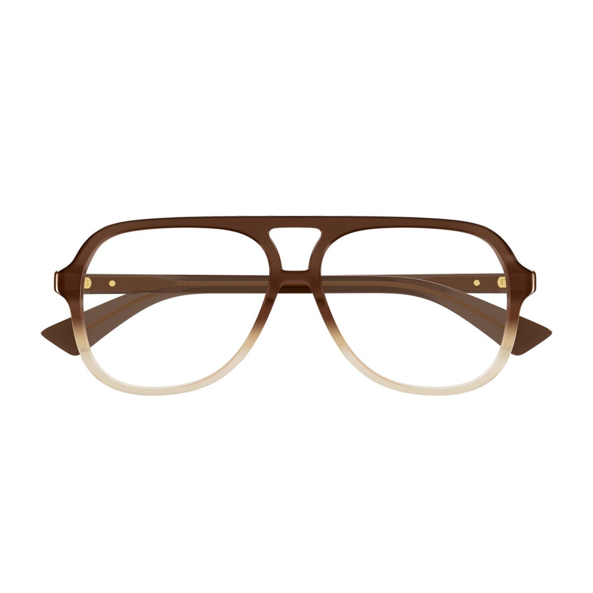 The Bottega Veneta BV1417O eyeglass model, part of the exclusive Ribbon Line, is the ultimate expression of refined elegance revealed through meticulous attention to detail. Crafted from transparent brown gradient acetate, these glasses represent a sophisticated reinterpretation of the iconic pilot style. The frame stands out for its bold yet harmonious shape, enhanced by a double bridge that infuses a touch of vintage inspiration. The design is further enhanced by the temples, decorated with the unmistakable Ribbon motif: a double metal stripe that is the brand's distinctive and unmistakable signature.