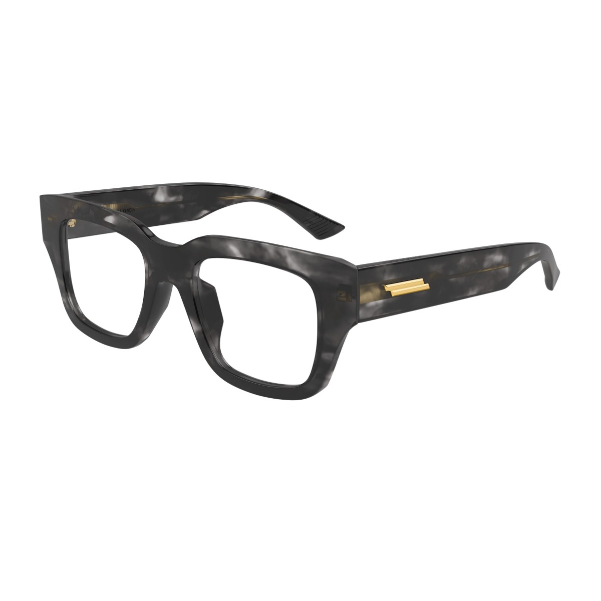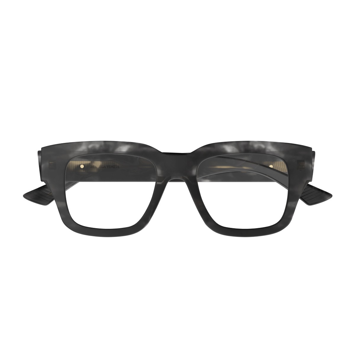 The new BV1361O optical frame from the Ribbon Line features an oversized rectangular shape crafted in smoky grey-shaded black havana acetate. The design stands out for its striking visual effect: the structure appears bold from the front yet slender when viewed from above, creating an elegant and dynamic interplay of contrasts. The temples, embellished with the iconic Ribbon double metal stripe, embody the unmistakable signature of Bottega Veneta’s style.