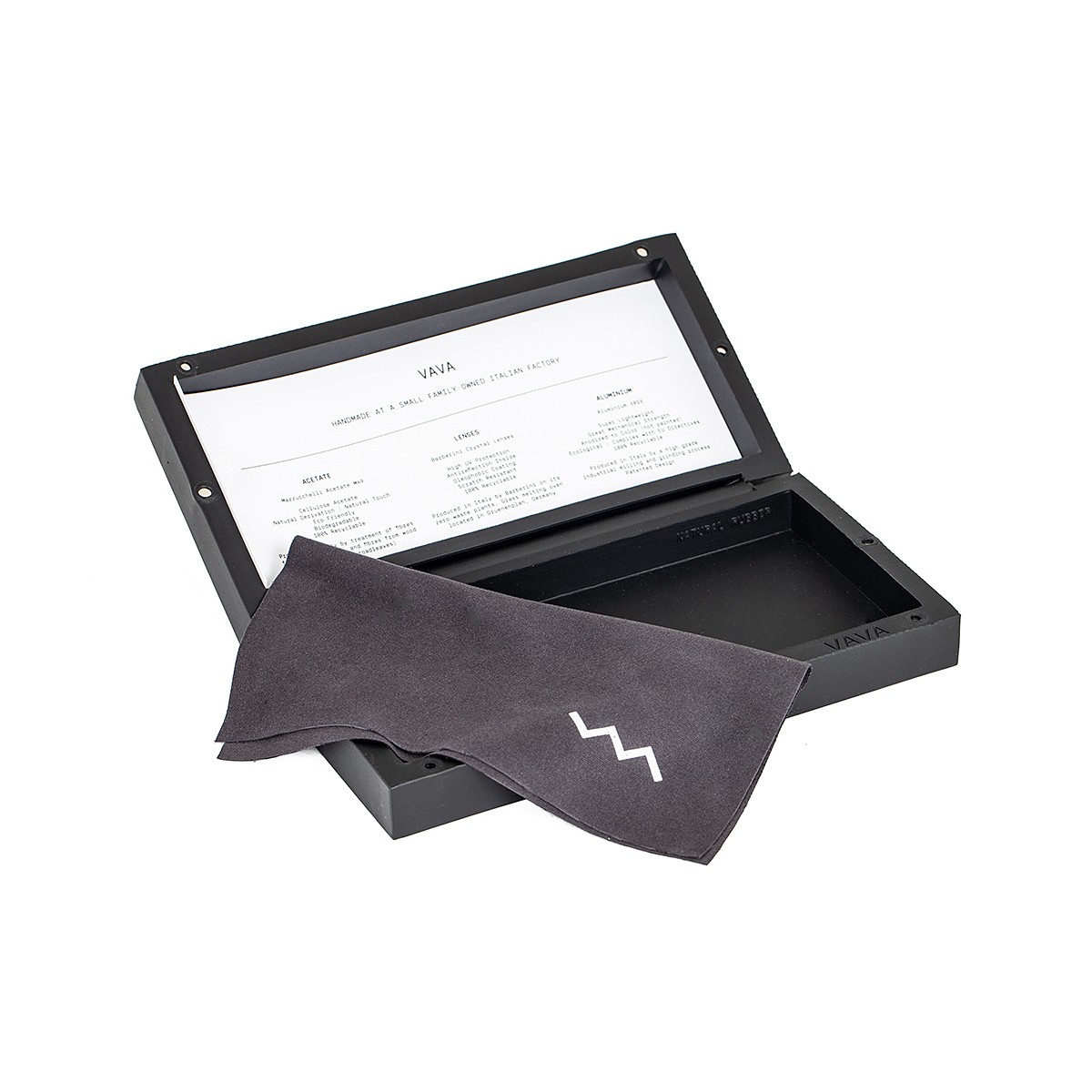 VAVA stands at the forefront of innovation through its strong commitment to sustainability, offering handcrafted eyewear made entirely in Italy from recycled, low-impact materials.The WL0065 model from the White Label line features a matte black bio-acetate frame with a distinctive rectangular shape, paired with black lenses.The design is enhanced by the temples' sophisticated construction, enriched with aluminum details that add a modern and elegant touch.