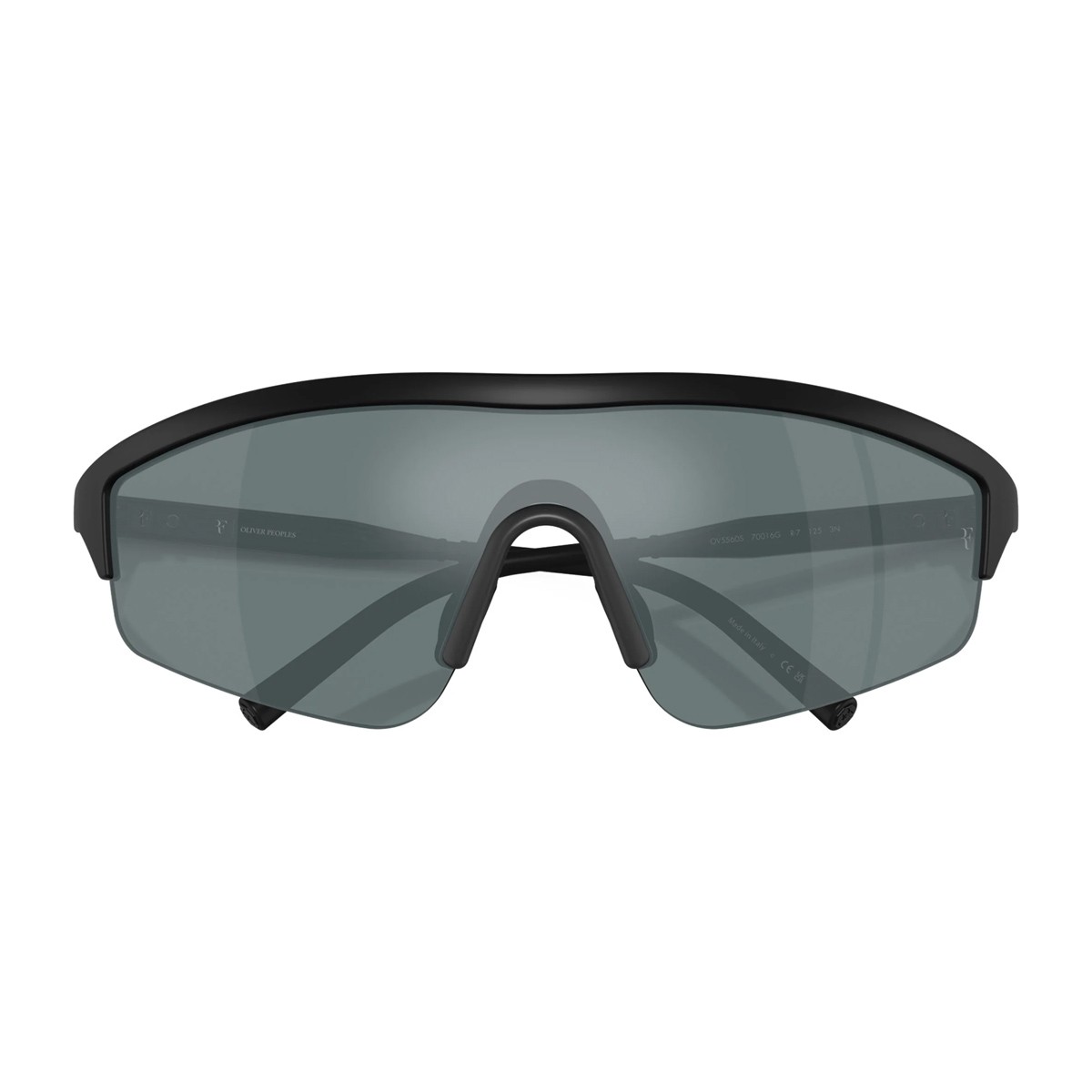 The new Oliver Peoples OV5560S R-7, born from the prestigious collaboration with Roger Federer, combines sporty design with technological innovation.This semi-rimless shield-style sunglass in semi-matte black propionate features a wraparound front paired with sleek gray flash mirror lenses for a dynamic, modern look.Designed to deliver comfort and high performance, the R-7 offers a tailored fit thanks to its bio-nylon brow, rubber nose pads, and adjustable temple tips. Its ultra-lightweight structure makes it the ideal accessory for those seeking a versatile, sporty, and elegant look, without compromising on everyday