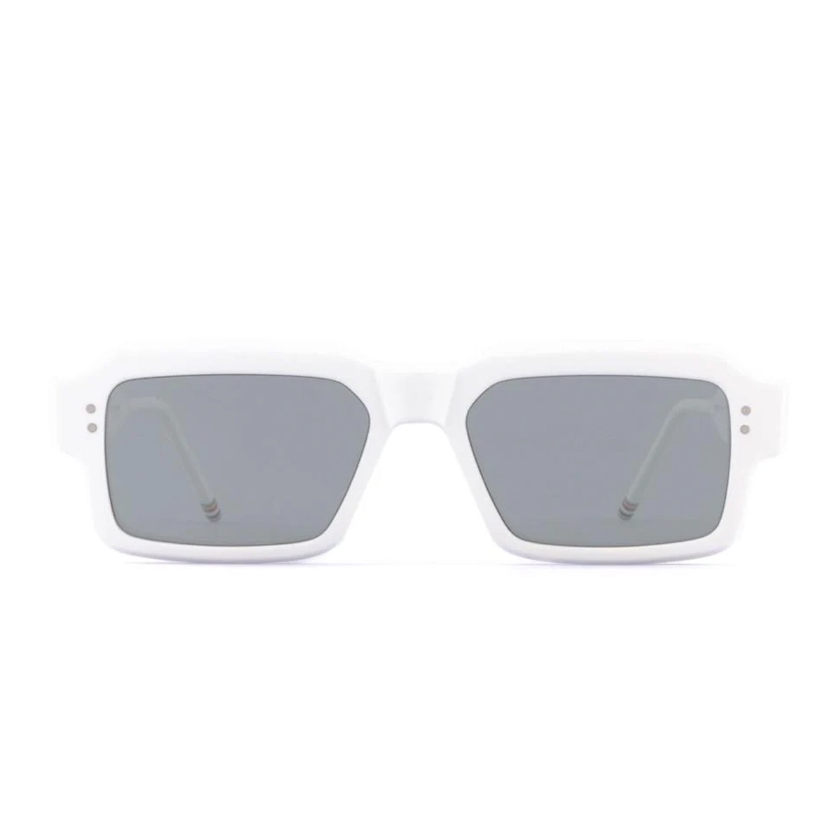 Bold style and unmistakable character: the UES924A - G0002 sunglasses by Thom Browne are designed for those who want to stand out with a unique, contemporary look. The high-quality white rectangular acetate frame pairs perfectly with flash grey lenses, adding depth to the gaze and a touch of refined elegance.Handcrafted in Japan, these sunglasses offer lightweight comfort, durability, and an impeccable fit, making them ideal for elevating every moment of the day with style. Iconic details – from the signature 4-bar design to the striped red, white, and blue enamel temple tips – complete the design with a distinctive mark of subtle yet instantly recognizable luxury.