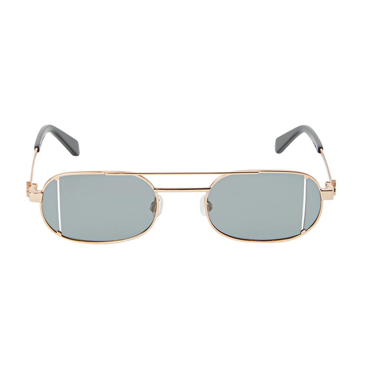 The Off-White™ OERI14H Lynn reinterprets the classic pilot style with a touch of minimalist design and contemporary spirit. The gold-tone metal frame with a double bridge combines elegance and character, while the slightly rounded rectangular shape enhances facial features with refinement. A distinctive element of this model is the cut-out detail on the grey-tinted lenses, an innovative feature that gives a bold and original look, perfect for those who love to stand out with iconic accessories. The slim temples are embellished with a small Arrow logo plaque, a signature of the brand.