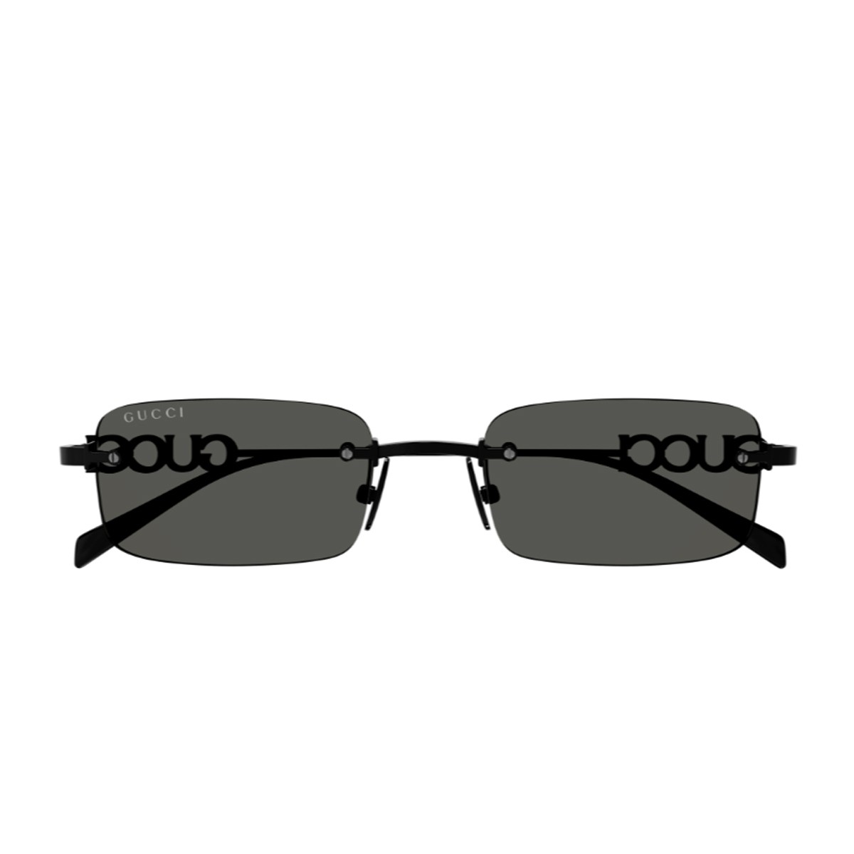 The Gucci GG1808S sunglasses embody the perfect balance between elegance and modernity. The silver-tone rimless metal frame is paired with bold rectangular dark gray lenses, while the temples are adorned with the three-dimensional Gucci logo—an iconic detail that enhances the model’s exclusivity. Minimal yet sophisticated, it is the ideal accessory for those seeking a contemporary and luxurious style.