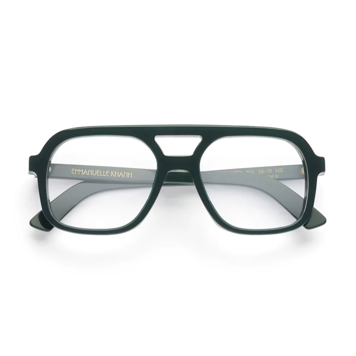 Emmanuelle Khanh frames celebrate Parisian elegance with bold, timeless designs, transforming every gaze into an icon of style. The Massa optical model conveys a strong character, blending retro charm with contemporary spirit. The frame stands out for its pilot shape and refined forest green acetate, meticulously handcrafted in France. Completing the design are the bold double top bridge and temples embellished with the EK monogram in gold-plated metal, set beneath resin