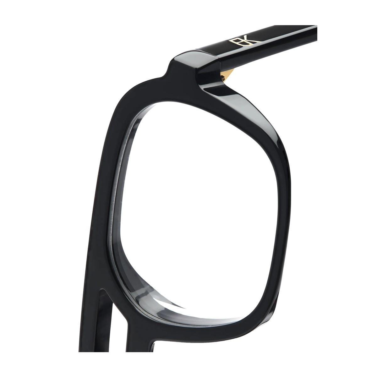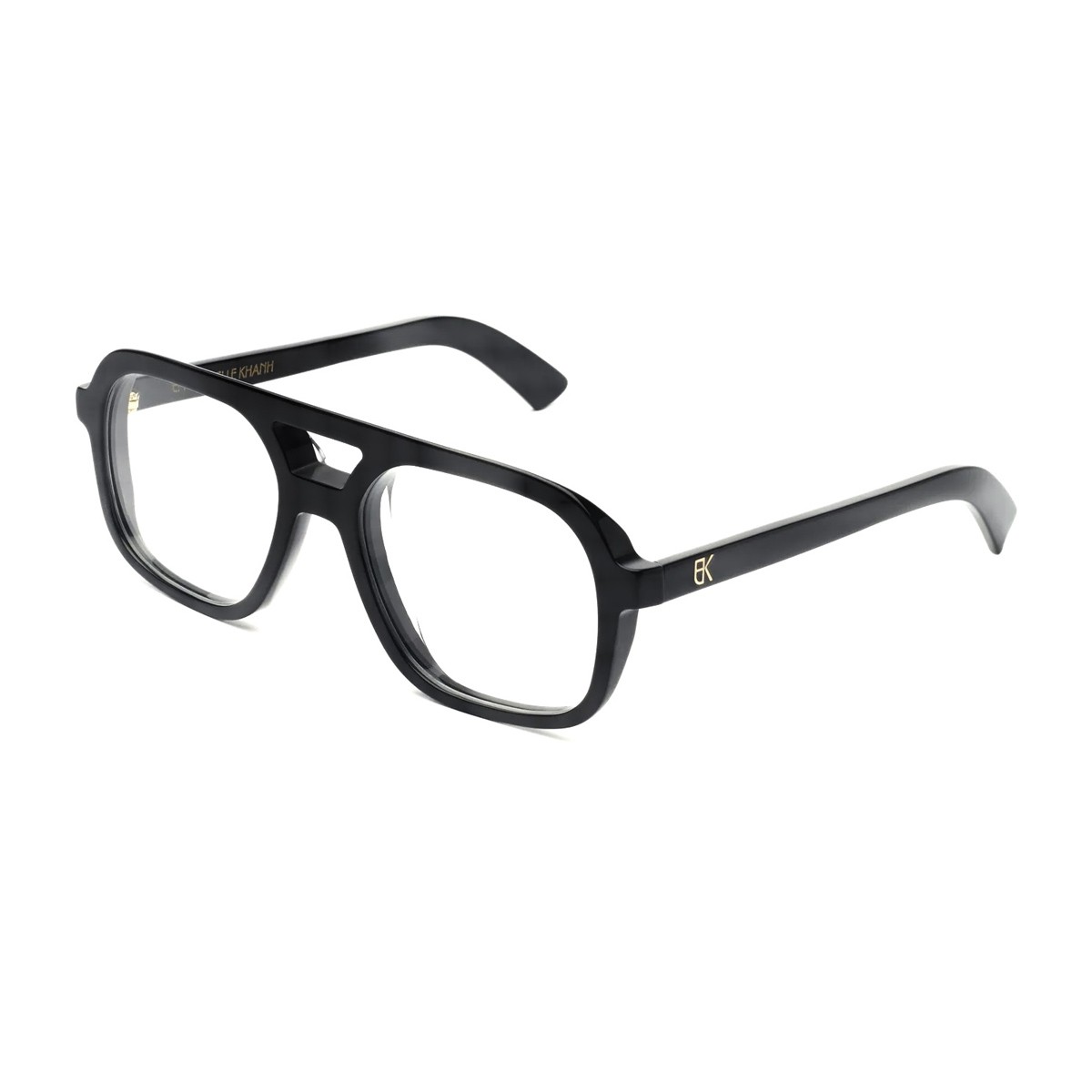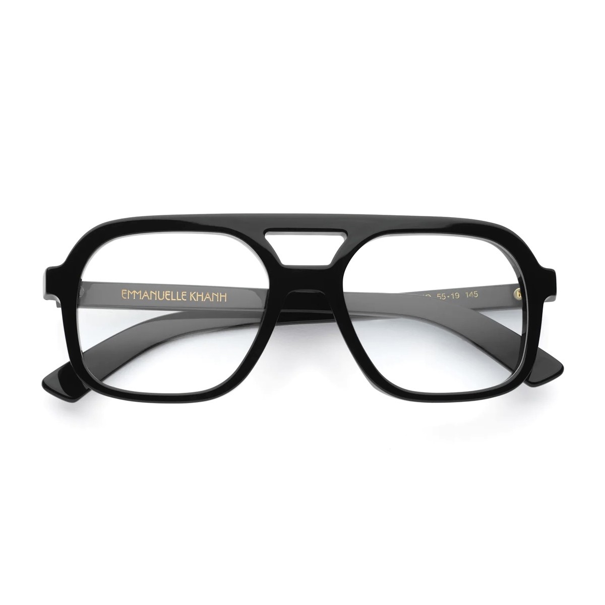 Emmanuelle Khanh frames celebrate Parisian elegance with bold, timeless designs, transforming every gaze into an icon of style. The Massa optical model embodies a strong character, blending retro charm with contemporary spirit. The frame stands out for its pilot shape and refined black acetate, meticulously handcrafted in France. Completing the design are the distinctive double top bridge and temples adorned with the EK monogram in gold-plated metal, set beneath resin.