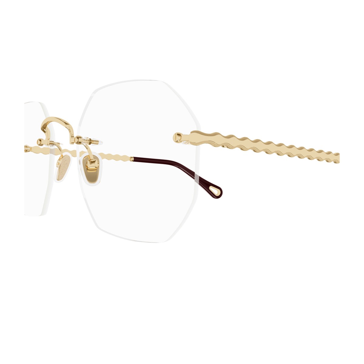 The new Chloé CH0270O optical frame, part of the Chloé Eyewear line, embodies the essence of refined femininity and the light, distinctive style of the Maison.This rimless geometric model stands out for its exceptionally lightweight structure, enhanced by sophisticated details that emphasize its contemporary elegance.The slim gold metal temples feature the iconic Chloé wavy motif, a refined element that reflects the brand’s soft and modern aesthetic. Completing the design, the glossy burgundy temple tips are adorned with the signature teardrop-shaped metal detail, a distinctive hallmark of the Chloé Eyewear collection.