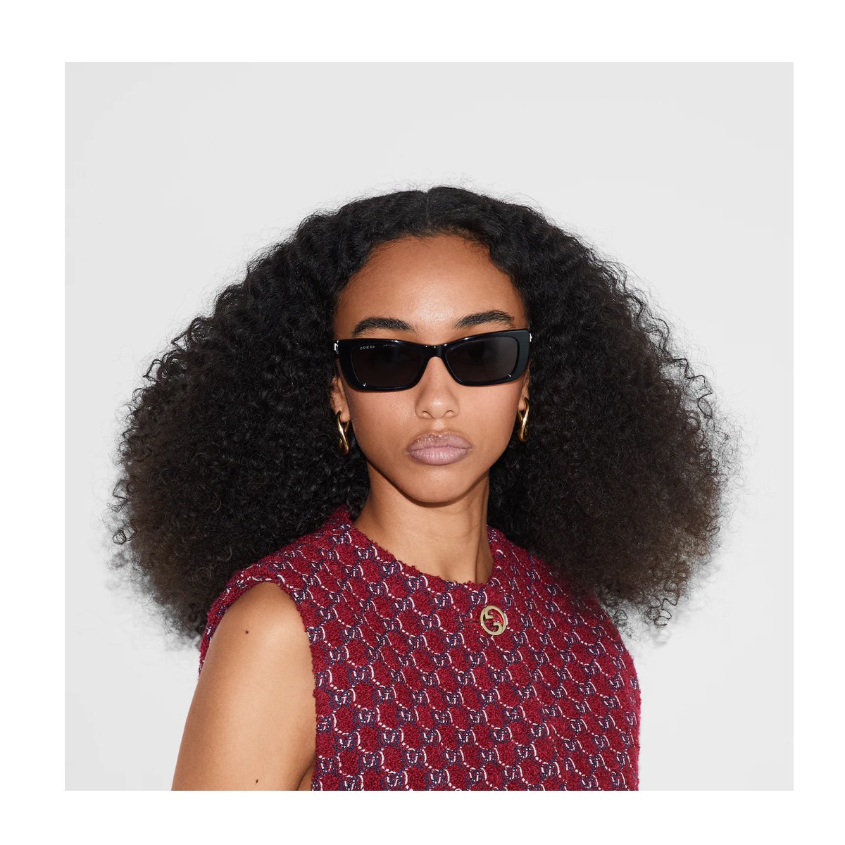 The new GG1680S sunglasses model from the GG LOGO line perfectly embodies the glamorous style of the '90s. The black injected acetate frame features an oval cat-eye shape, paired with gray-tinted lenses. The temples are embellished with the new squared G Gucci metal logo, adding a touch of modern elegance.