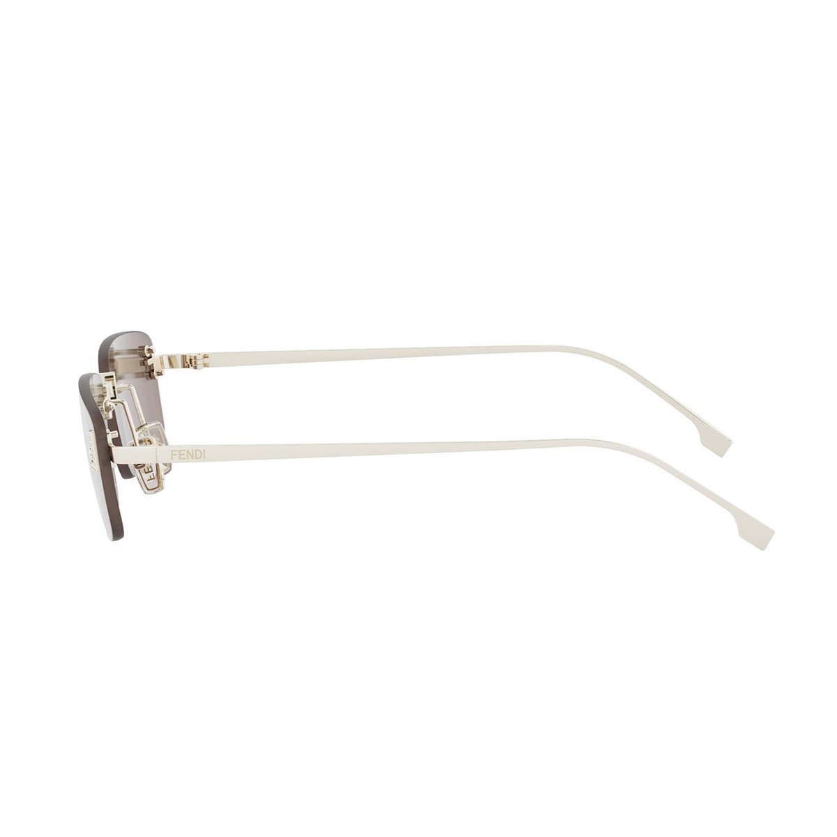 An elegant evolution of the Fendi First Crystal family, this rectangular rimless model features a sleek metal structure, brown lenses adorned with the Pequin pattern, and micro “F” details in crystals for a refined touch.