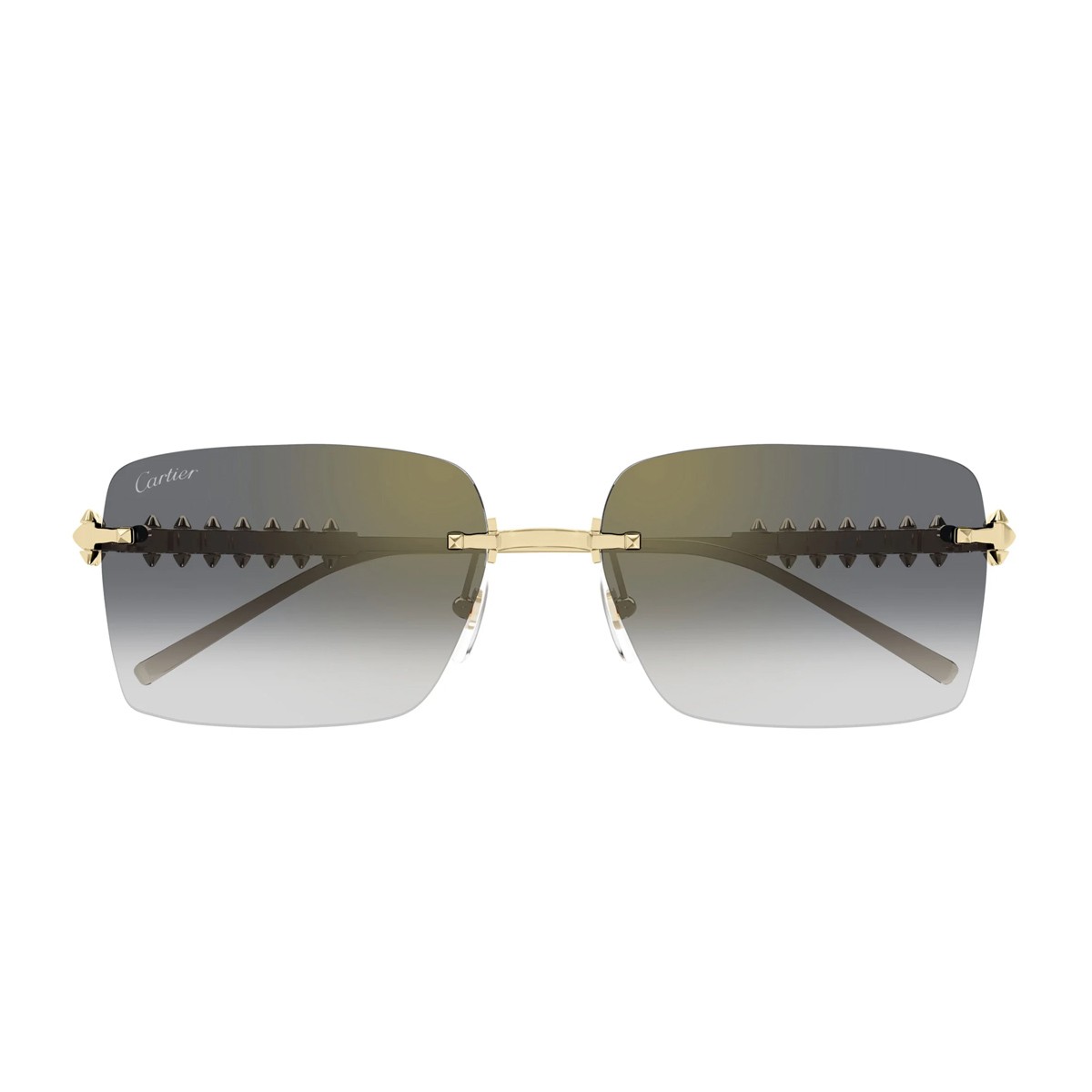 The new CT0545S sunglasses from the Clash de Cartier line reinterpret the bold spirit of the namesake collection with a striking and sophisticated design.The rimless frame stands out for its square shape and gradient grey lenses with a golden flash finish.The gold-tone metal temples are embellished with the signature “Picot” detail—a three-dimensional pyramid stud that moves slightly, evoking the dynamic nature of the Maison’s jewelry.An iconic element of the Clash line, it draws inspiration from the textures of Cartier’s high jewelry, reimagined with a modern edge.