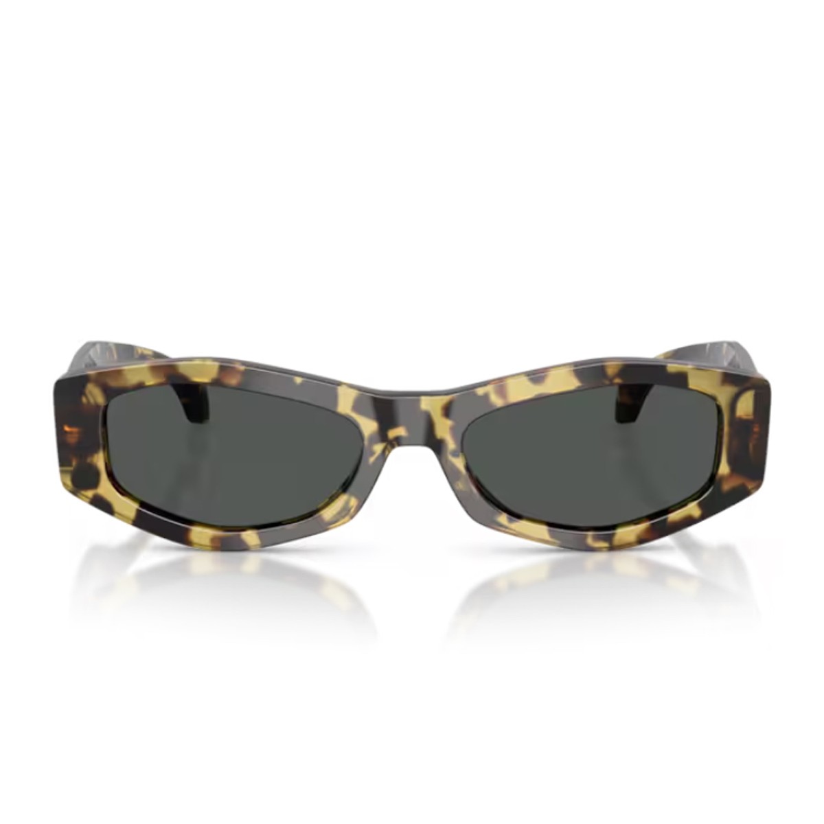 The new Versace 0VE4487 sunglasses stylishly echo the iconic aesthetic of the ’90s. The yellow and brown havana acetate frame features a bold, three-dimensional geometric shape with a low-lens design in a sophisticated dark grey tone. Completing the design, the iconic Versace logo in raised relief on the temples adds a distinctive and bold touch that highlights the fashion-forward character of the model.