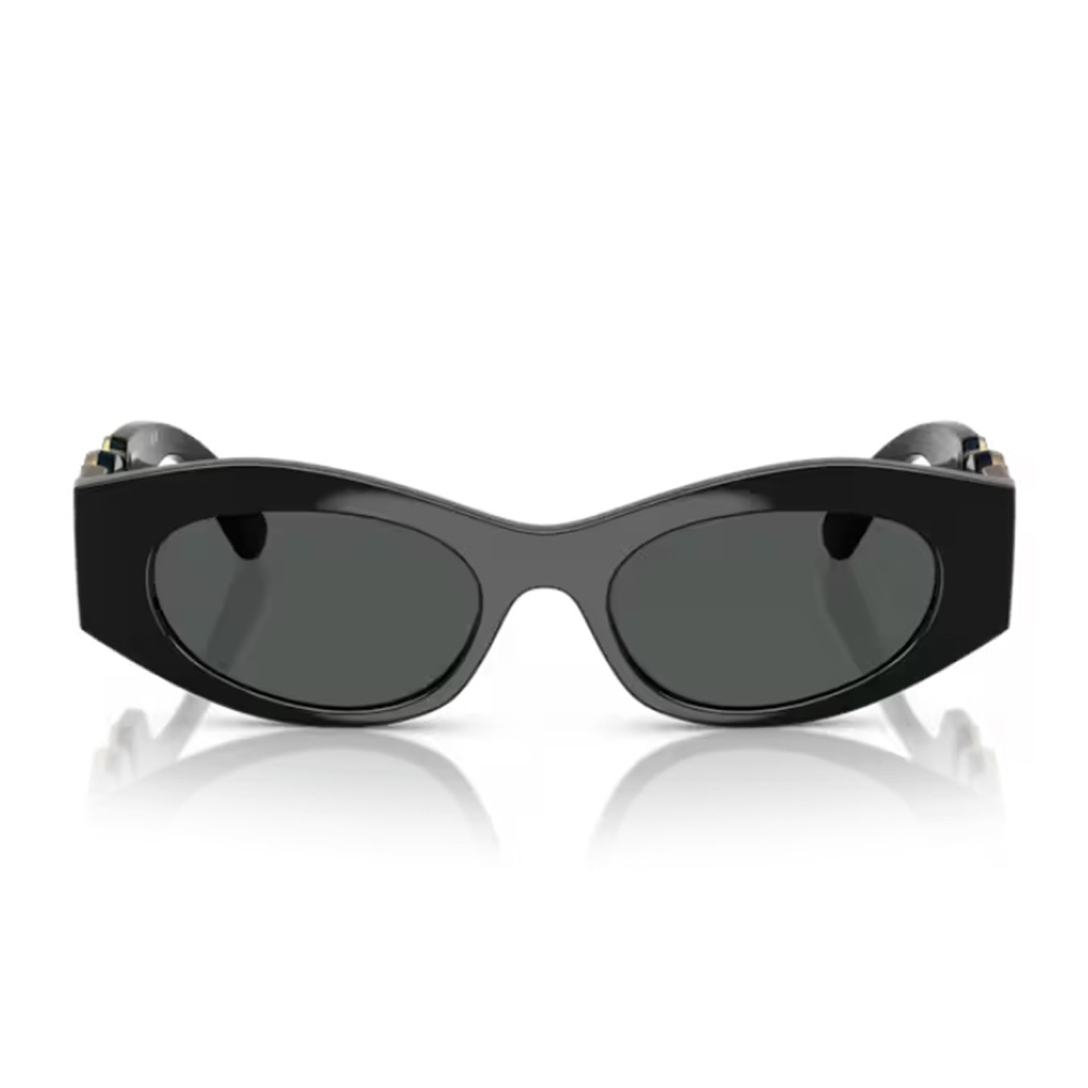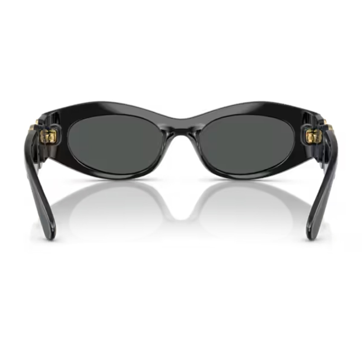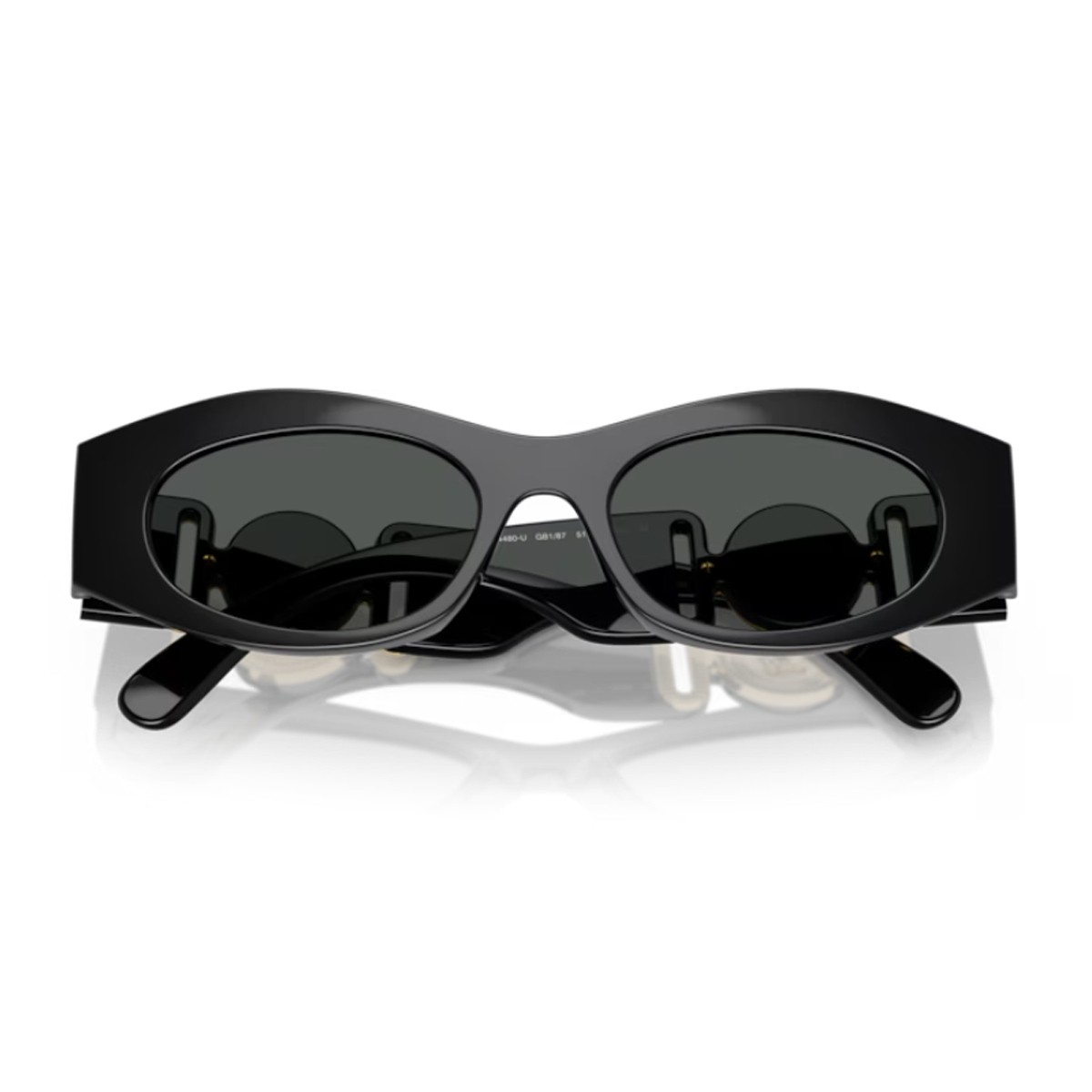 The new Versace 0VE4480U sunglasses are inspired by the legendary Biggie model, faithfully capturing its bold spirit. The black injected frame features a striking cat-eye shape paired with dark grey lenses. The low-lens design reinforces a timeless style that remains contemporary and recognizable. The temples are adorned with iconic gold-tone metal Medusa head plaques on the front, a distinctive detail that enhances the strong character of the model.