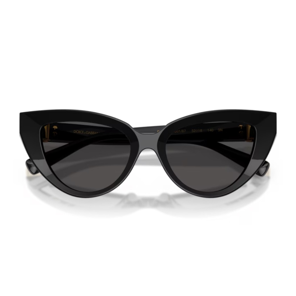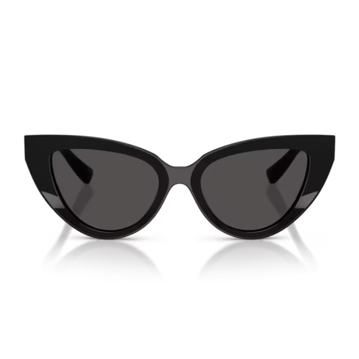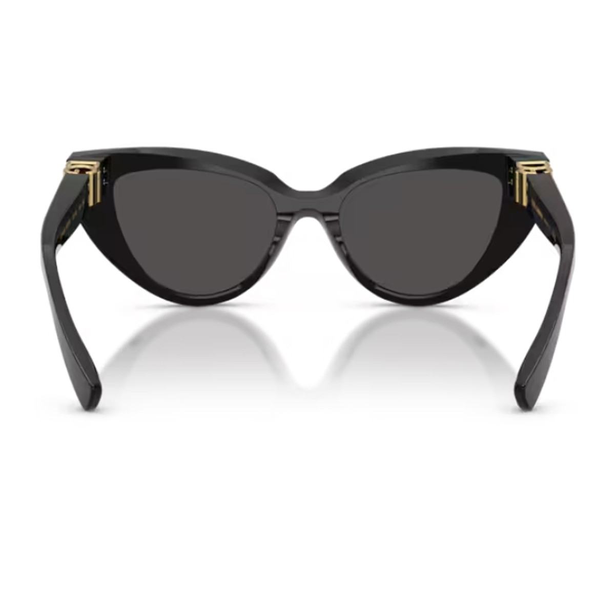 The new Dolce & Gabbana DG4497 sunglasses feature an elegant cat-eye shape in black acetate with a vintage charm, paired with tone-on-tone lenses. The subtly faceted front adds character to the design, while the temples reveal the iconic crossed DG logo when viewed from above, seamlessly doubling as a refined functional hinge.
