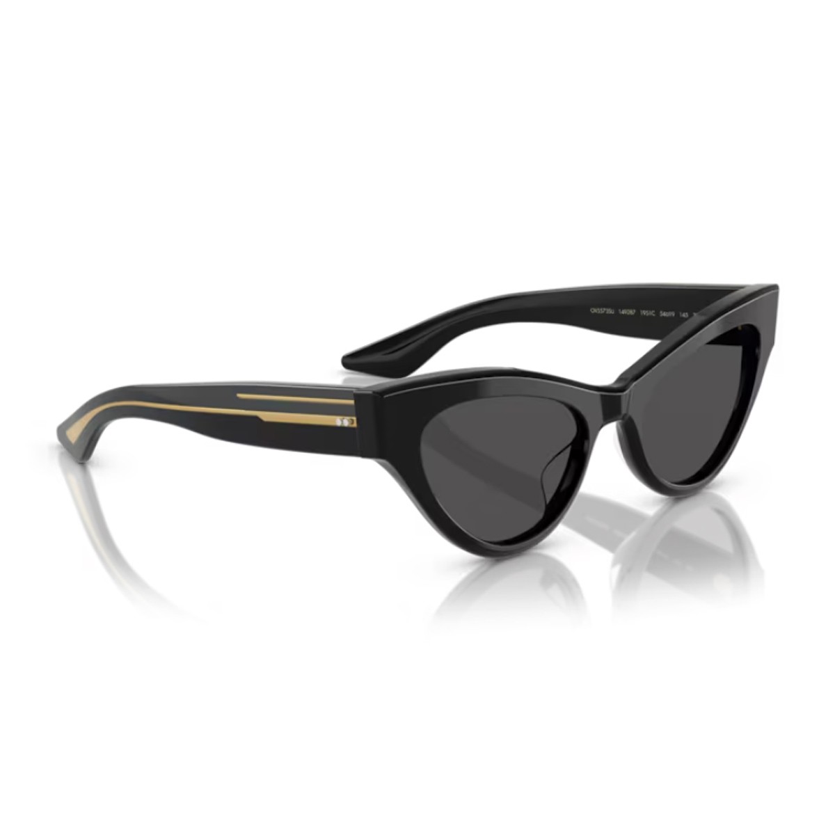 The Oliver Peoples OV5573SU - 1951C model, born from the prestigious collaboration with Khaite, is a refined pair of sunglasses that blends vintage elegance with contemporary design.The black acetate cat-eye frame, with its elongated profile, enhances femininity while adding a sophisticated, modern touch to the face. The tone-on-tone lenses complete the look with a minimal and refined style.The temples, featuring a custom metal core with visible detailing, highlight the brand’s meticulous attention to design. The iconic Khaite logo engraved on the inner tip of the temple serves as a discreet yet unmistakable signature of this exclusive collaboration.