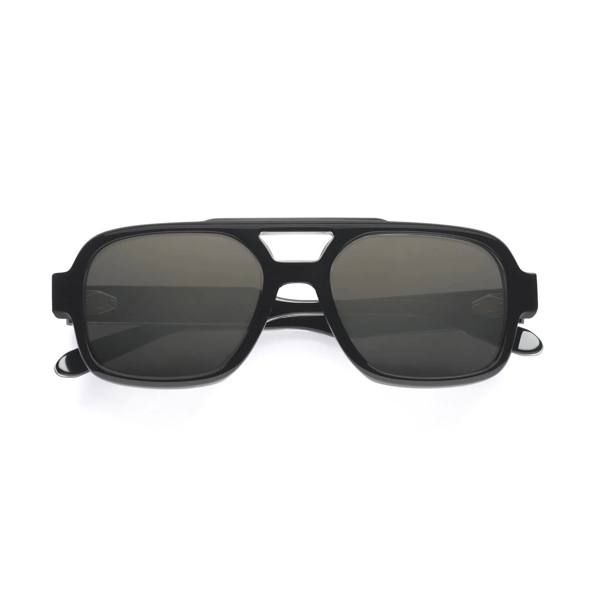 Emmanuelle Khanh frames embody Parisian elegance with bold, timeless lines, transforming every gaze into an icon of style. The Hero sunglasses model conveys a strong character, blending retro charm with contemporary spirit. The frame, with its pilot silhouette and distinctive double bridge, is crafted from fine black acetate, meticulously handmade in France. Completing the design are dark grey lenses and temples embellished with the EK monogram in gold-plated metal set beneath resin, the Maison’s unmistakable signature.