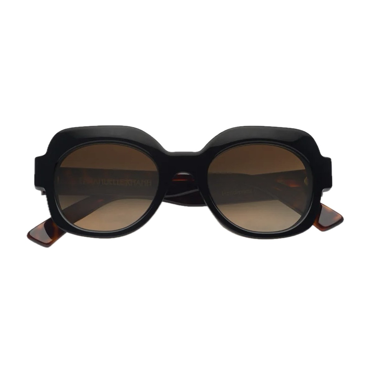 Emmanuelle Khanh frames embody Parisian elegance with bold, timeless lines, transforming every gaze into an icon of style. The Satin sunglasses refine the Maison’s bold and sophisticated aesthetic, standing out with a geometric design defined by sharp, modern lines. The silhouette is crafted from fine glossy black acetate, meticulously handmade in France, and enhanced with tortoiseshell acetate temples that add depth and an elegant chromatic contrast.The design is completed by gradient brown lenses that blend harmoniously with the frame, while the temples are adorned with the EK monogram in gold-toned metal set under resin.