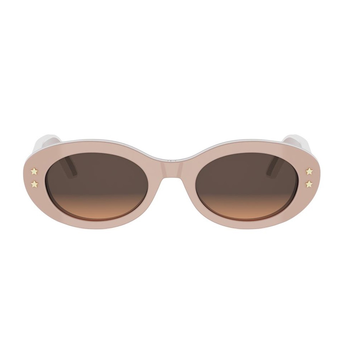 This model from the DiorPacific line features an elegant oval acetate frame. The contrasting logo, together with the gold-tone star-shaped metal rivets, adds a distinctive touch of style. The outer temples are adorned with the Christian Dior logo in bas-relief, enhanced by enamel details.