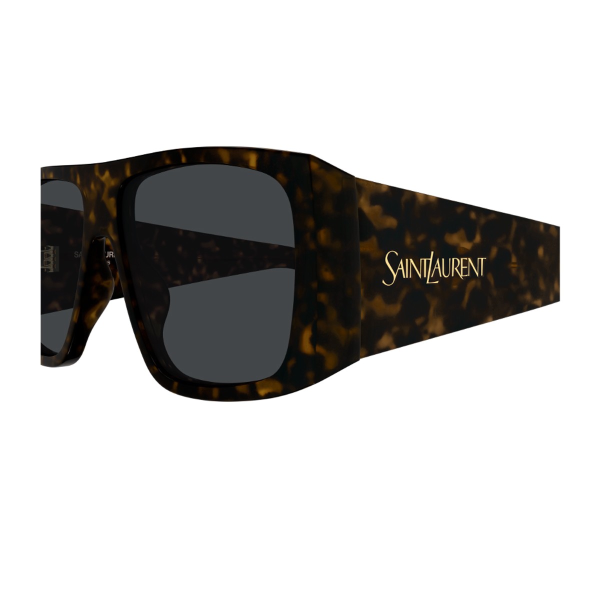 The new Saint Laurent SL 832 model from the SL Logo line embodies the essence of the Maison’s bold yet refined style, merging contemporary spirit with timeless elegance.The oversized rectangular frame with a flat top, crafted in dark havana acetate, features clean, graphic lines that define a strong and distinctive look.The dark grey lenses add depth and intensity to the gaze, completing the design with a mysterious and sophisticated allure. The look is finished with sculpted temples, adorned with the Saint Laurent logo engraved in metal, a subtle detail that signs a model of bold character, symbolizing an iconic, audacious, and contemporary style.