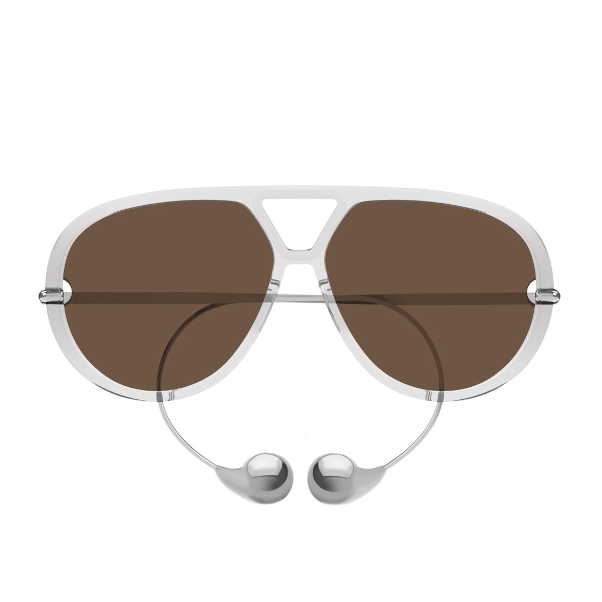 Il modello da sole BV1273S della linea Unapologetic è una novità assoluta in casa Bottega Veneta , con il suo design minimalista e sofisticato, incarna la femminilità distintiva della Maison. La montatura in acetato riciclato presenta un frontale color grigio trasparente dalla forma pilot, abbinato a lenti sui toni del marrone. Il design è arricchito dalle aste in metallo color oro con una lavorazione particolare a forma di goccia, che riproduce con eleganza l’effetto di un orecchino.