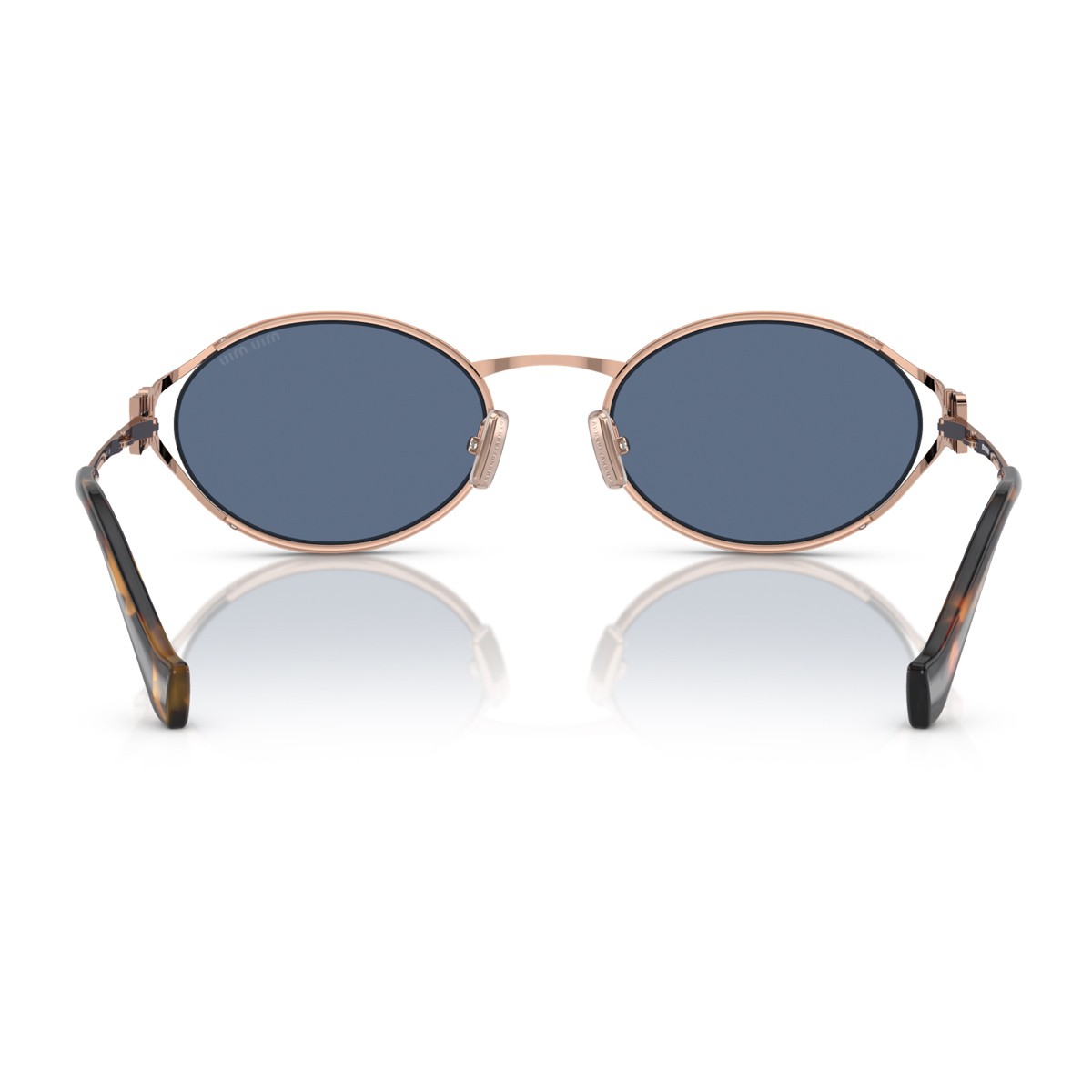 Con il modello da sole 0MU 52YS, Miu Miu conferma ancora una volta la sua capacità di sorprendere, sfuggendo all’ordinario. Questo modello introduce una nuova forma ovale reinterpretata con un tocco inaspettato: la montatura in metallo oro rosa si distacca in modo originale dalle lenti blu scuro, creando un effetto di rottura visiva prima di congiungersi con la cerniera impreziosita dall’iconico logo verticale Miu Miu.