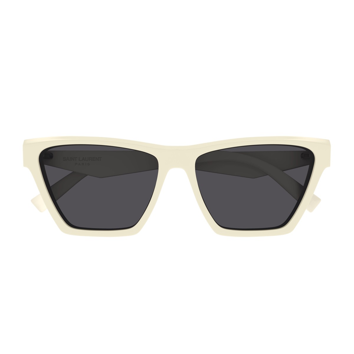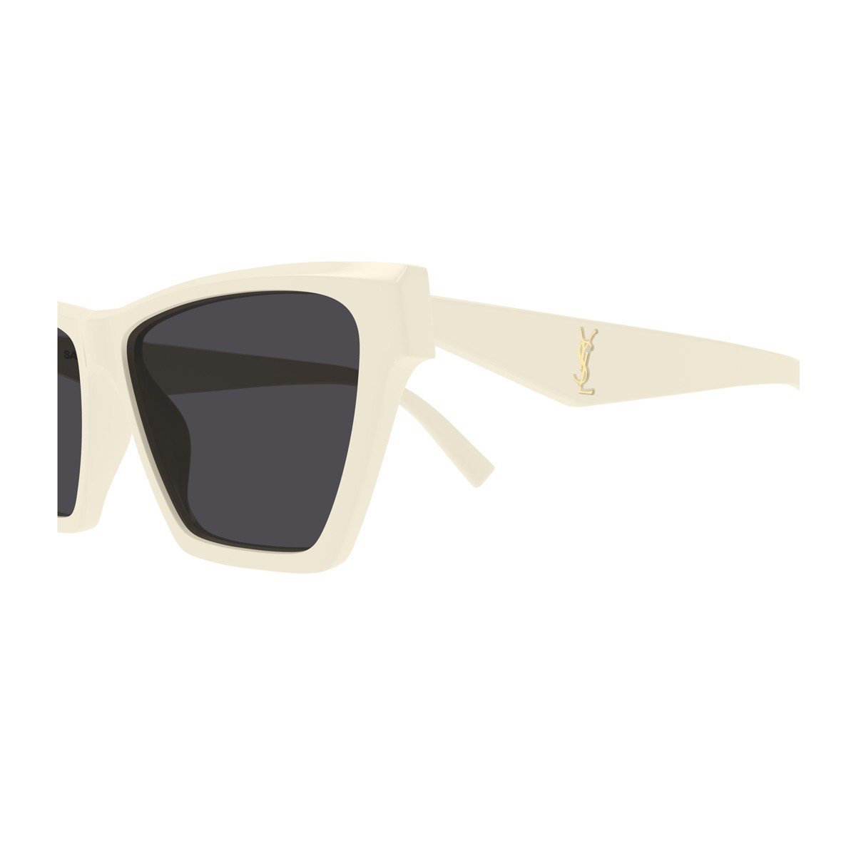 Occhiali da sole femminili della Linea Monogram con montatura in acetato avorio e lenti nere. Questo modello si distingue per la silhouette decisa e per l’inedita reinterpretazione della forma cat-eye, espressione di uno stile audace e sofisticato. Le aste, dal design originale, sono impreziosite dall’iconico logo YSL posizionato in modo perfetto e armonioso, per una firma di eleganza distintiva.