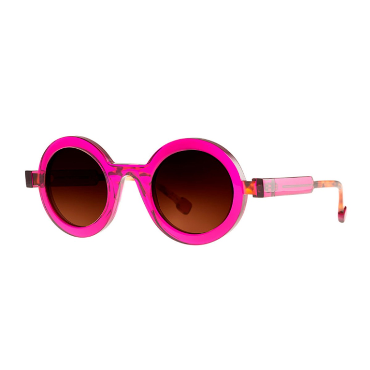 IIl modello Cassette 7 di Theo Eyewear, parte della collezione Gears, è una dichiarazione di stile audace e fuori dagli schemi. Con la sua forma rotonda oversize e la brillante montatura in acetato fucsia trasparente, questo occhiale da sole cattura lo sguardo e trasmette energia creativa e personalità. Le aste traslucide multicolore con terminali sagomati, unite alle lenti sfumate marrone scuro, creano un equilibrio armonico tra esuberanza e funzionalità.