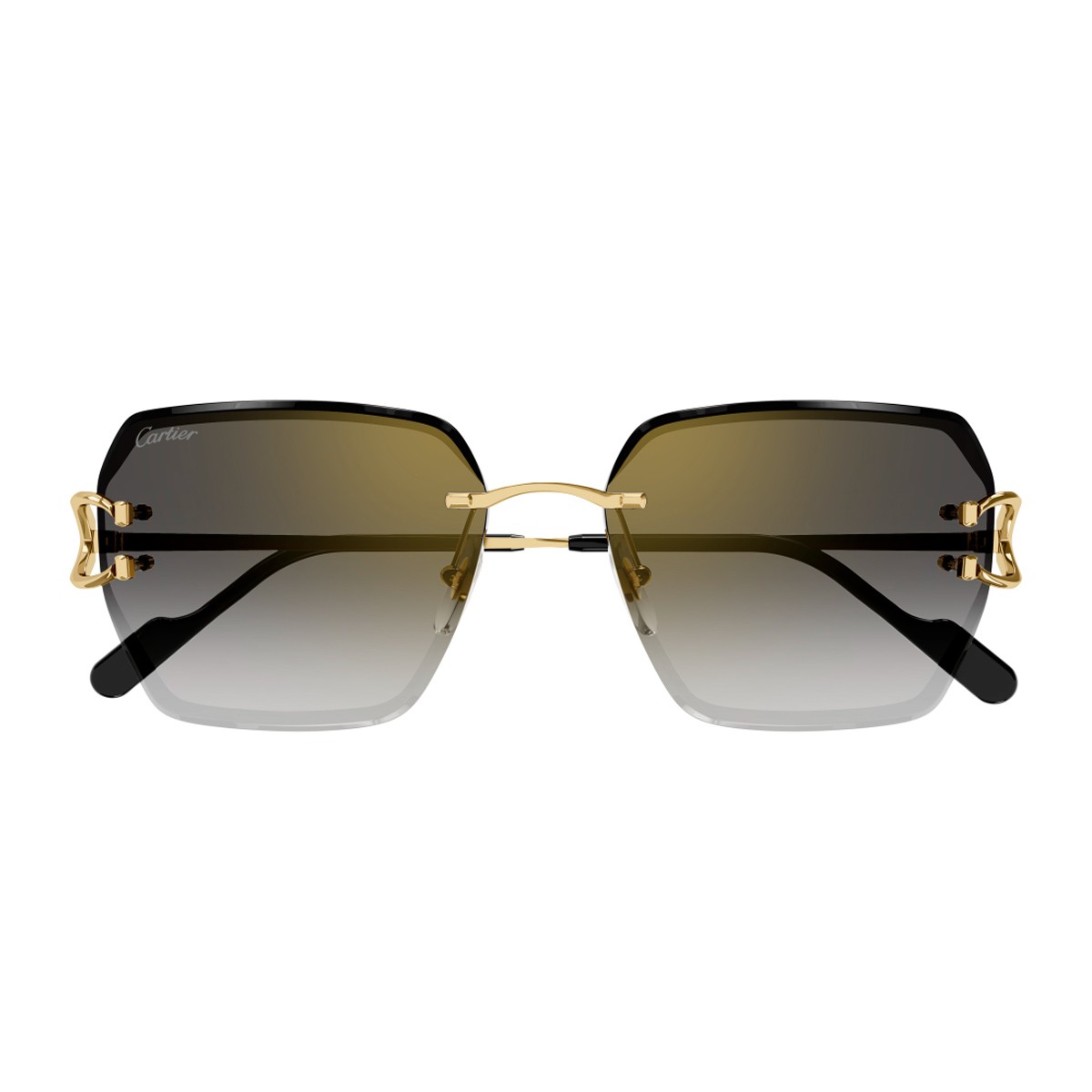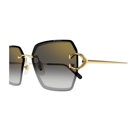 Il nuovo modello di occhiali da sole CT0466S della linea Signature C De Cartier presenta una raffinata montatura femminile contemporanea a giorno in metallo color oro, caratterizzata da una distintiva forma squadrata oversize dalle linee geometriche, abbinata a lenti grigio flashato oro. Il design è impreziosito dall'iconico dettaglio "C de Cartier" sulla cerniera in metallo, un elemento sia funzionale che estetico, completato da un elegante effetto smussato. Questo dettaglio dona uno stile moderno, mettendo in risalto la cura per i dettagli che contraddistingue la Maison.