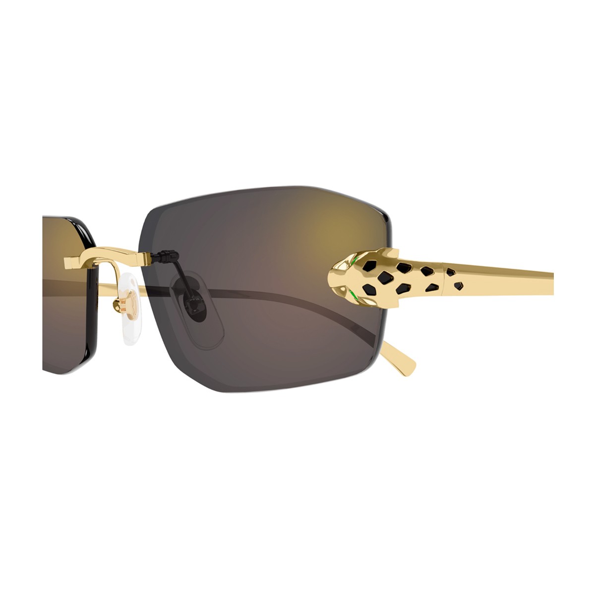 Gli occhiali Cartier rappresentano un'esplorazione dei territori stilistici della Maison, reinterpretati da una nuova prospettiva. Il marchio ha introdotto il lusso nel mondo degli occhiali, con una passione unica per il design. La linea Panthère de Cartier è rinomata per il suo stile sofisticato e la ricerca di elementi distintivi. In particolare, il nuovo modello CT0474S, ispirato ai gioielli Cartier, presenta una montatura a giorno in metallo con finiture in oro dalla forma rettangolare. Il design è arricchito dalla testa Panthère tridimensionale sul frontale, mentre le aste, che richiamano la testa e la coda Panthère, sono decorate da preziose macchie in smalto realizzate a mano, mettendo in evidenza l'attenzione ai dettagli della Maison.