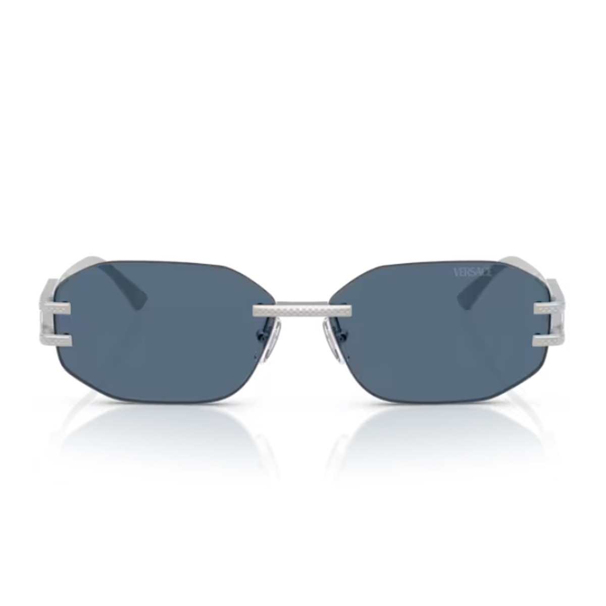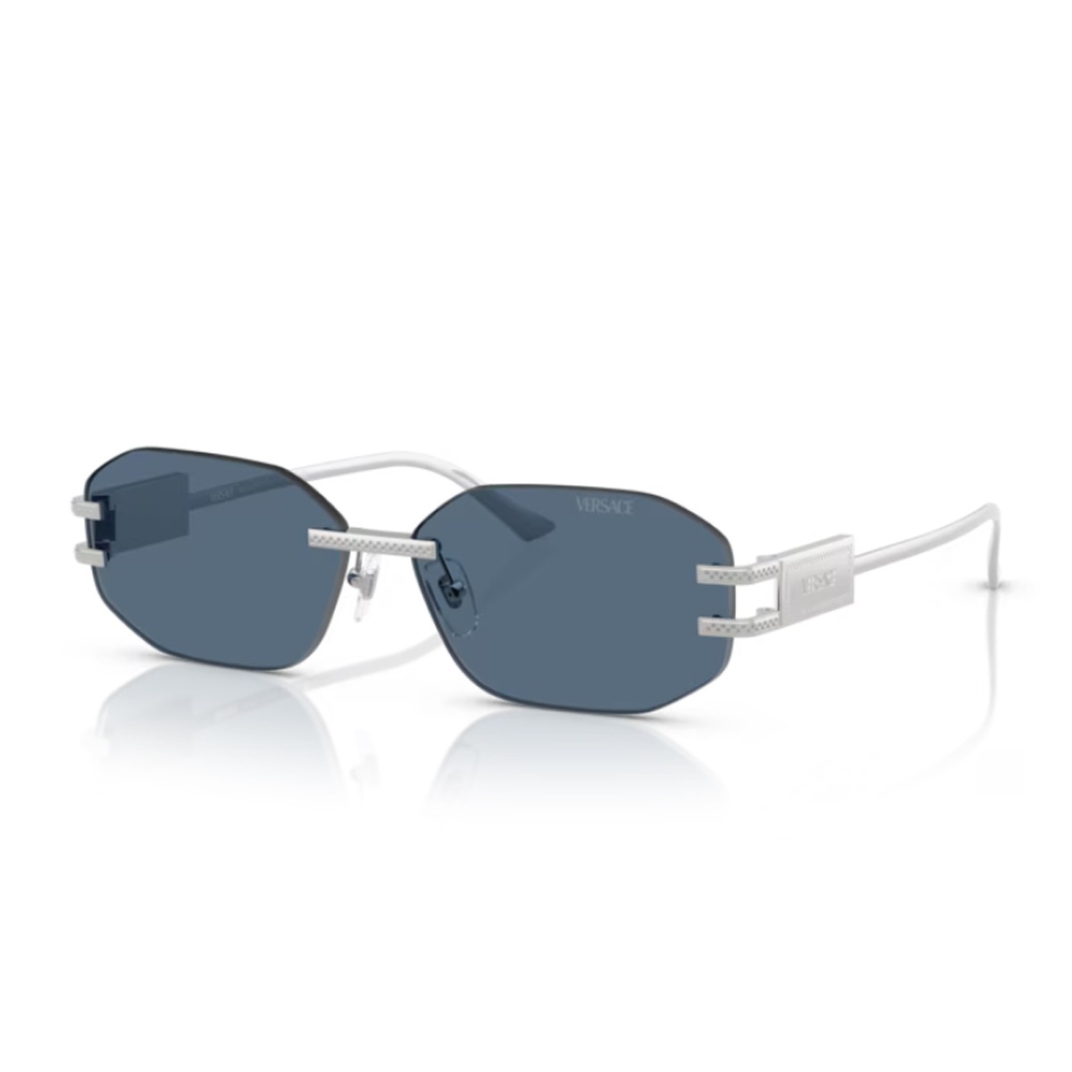 Il nuovo occhiale da sole Versace 0VE2274, ispirato alla silhouette stretta del best-seller Biggie, si distingue per il suo stile moderno e dal fascino unisex. La montatura rimless presenta una forma geometrica decisa, ideale per chi cerca un look ricercato e contemporaneo. Le aste in metallo color argento sono impreziosite dal raffinato motivo Damier e da una placca in metallo con logo inciso, dettaglio iconico che richiama l’eleganza di Versace. Le lenti in una delicata tonalità del blu scuro, prive di montatura, sono arricchite da un discreto logo laserato nell’angolo superiore sinistro, per un tocco finale di raffinatezza.