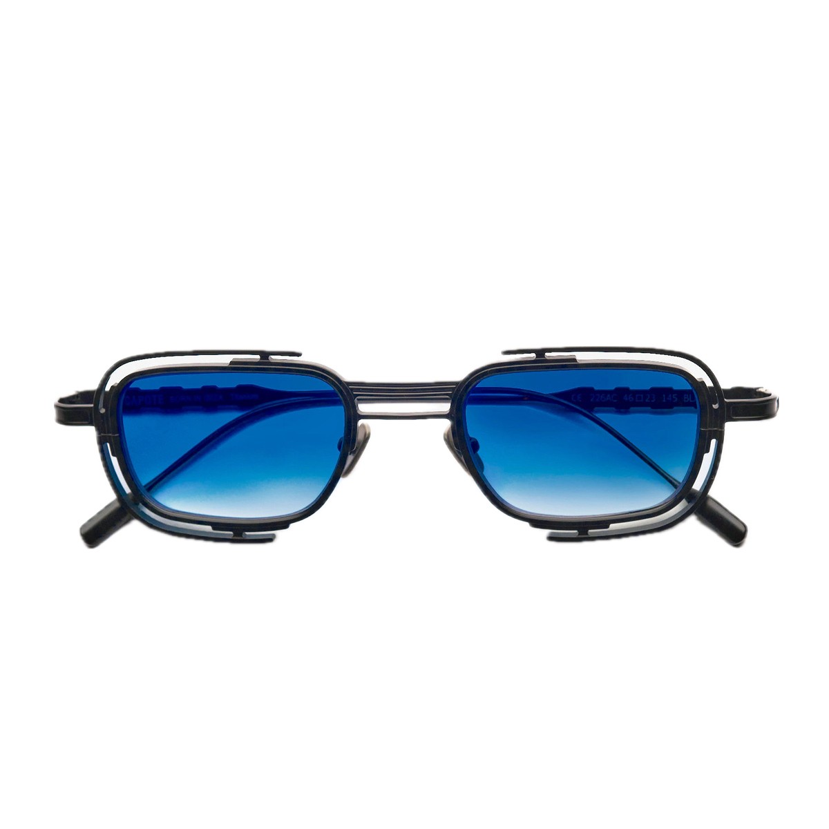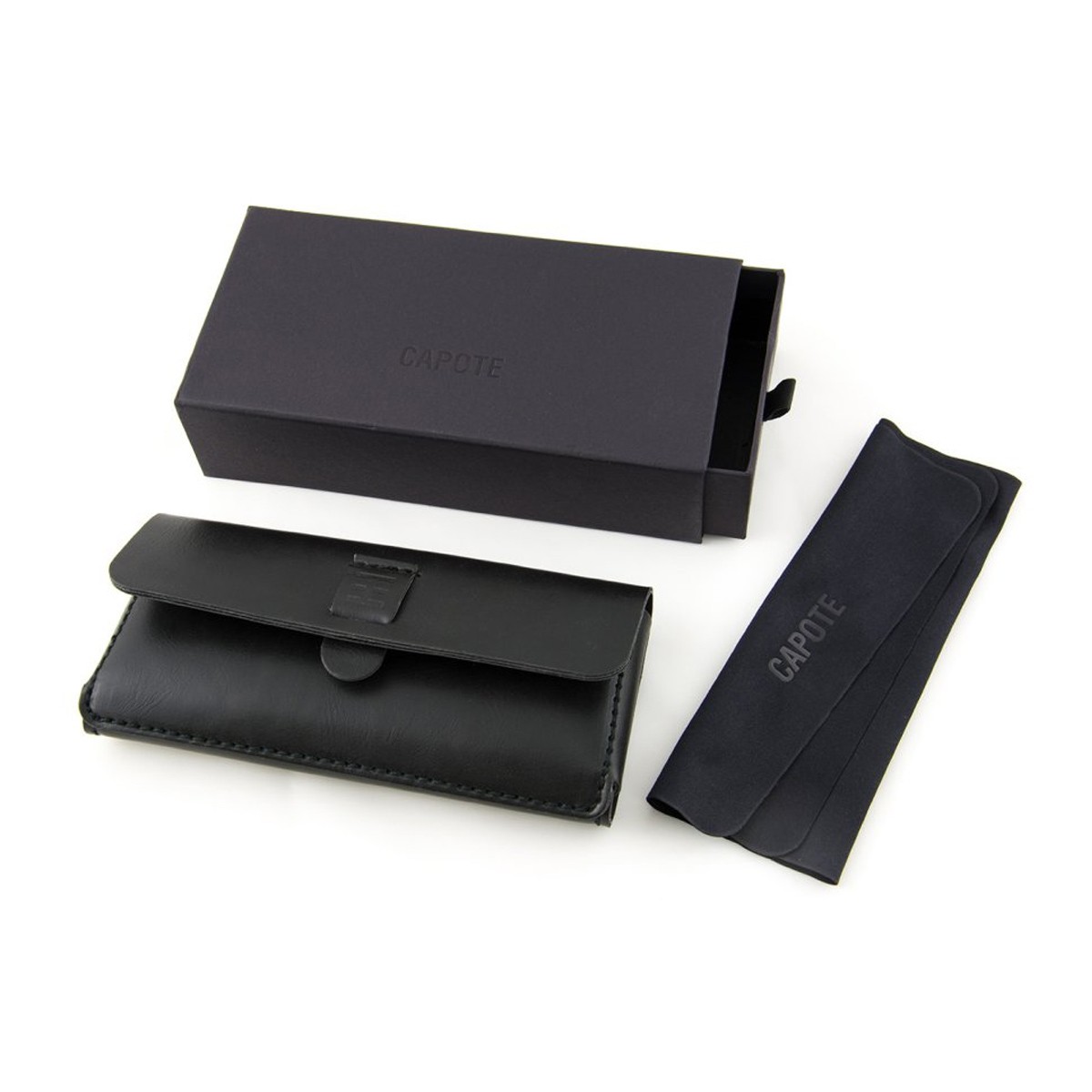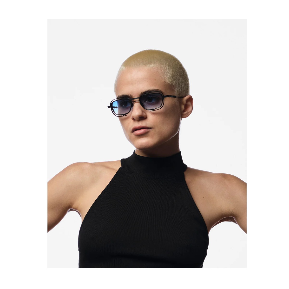 CAPOTE ridefinisce i confini dell’espressione personale, trasformando ogni montatura in una dichiarazione di stile. Il modello 226AC si distingue per un design d’avanguardia con aste sottili a doppia struttura, ponte lineare e una silhouette rettangolare allungata dai profili morbidi. Realizzato in titanio nero e abbinato a lenti sfumate in una delicata tonalità di blu, unisce eleganza, carattere e originalità.