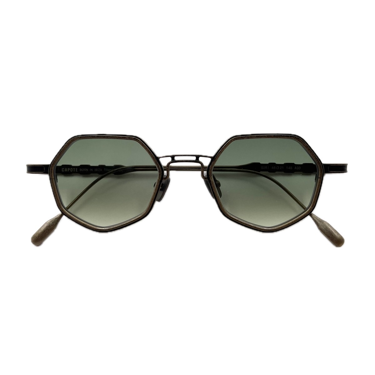 CAPOTE ridefinisce i confini dell’espressione personale, trasformando ogni montatura in una vera dichiarazione di stile. Il modello Guri incarna un design all’avanguardia con la sua forma geometrica realizzata in titanio color oro antico. Si distingue per le originali lenti eptagonali sfumate verdi e per il doppio ponte nasale, dove il ponte superiore, leggermente sporgente, dona alla montatura un senso di movimento e vitalità.