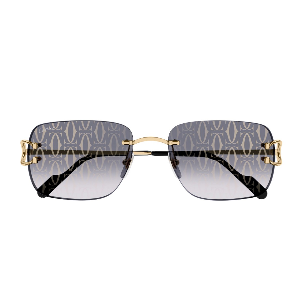 Il modello da sole Cartier CT0330S della linea Décor C de Cartier celebra la tradizione e il savoir-faire della Maison con un design deciso ed elegante. La montatura rimless in metallo dorato, dal carattere contemporaneo e sofisticato, si distingue per la forma rettangolare dalle linee geometriche pulite. Le lenti serigrafate in grigio chiaro aggiungono profondità allo sguardo e regalano un tocco di luce raffinato. Il design è arricchito dal Décor C Classique, che impreziosisce le aste con l’iconico “C de Cartier” sulla cerniera, reinterpretato come un elemento gioiello che unisce funzionalità e raffinatezza, e dal Décor C Allongé, che trasforma l’iniziale in un motivo distintivo e sofisticato.