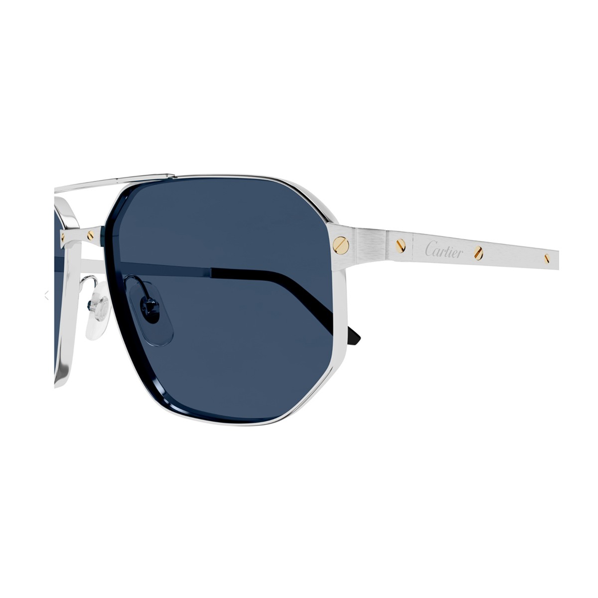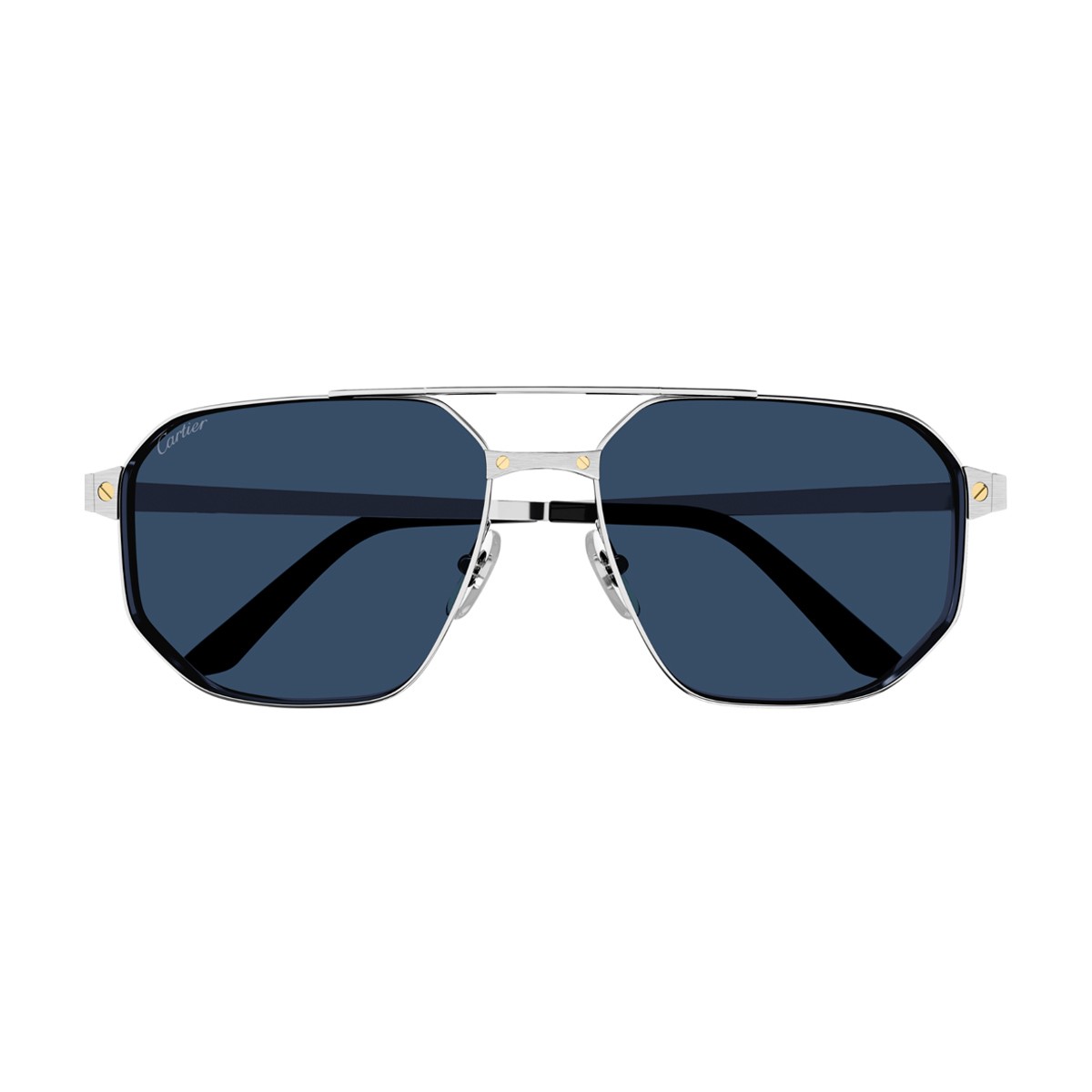 Le collezioni di occhiali Cartier rappresentano un'innovativa esplorazione dei territori stilistici della Maison, introducendo il lusso nel mondo degli occhiali con una passione unica per il design. La linea Santos de Cartier è rinomata per il suo design elegante e sofisticato. In particolare, il modello CT0462S presenta una montatura in metallo dalla forma pilot con doppio ponte per uno stile audace. Il design è arricchito dalla cerniera impreziosita da un sofisticato dettaglio, ispirato all'iconico bracciale. Le aste incise con le viti Santos e i terminali che richiamano il taglio della cassa dell'orologio Santos, adornati dall'iconica vite Santos, sottolineano l'attenzione ai dettagli distintiva della Maison