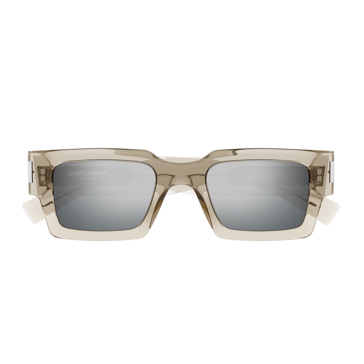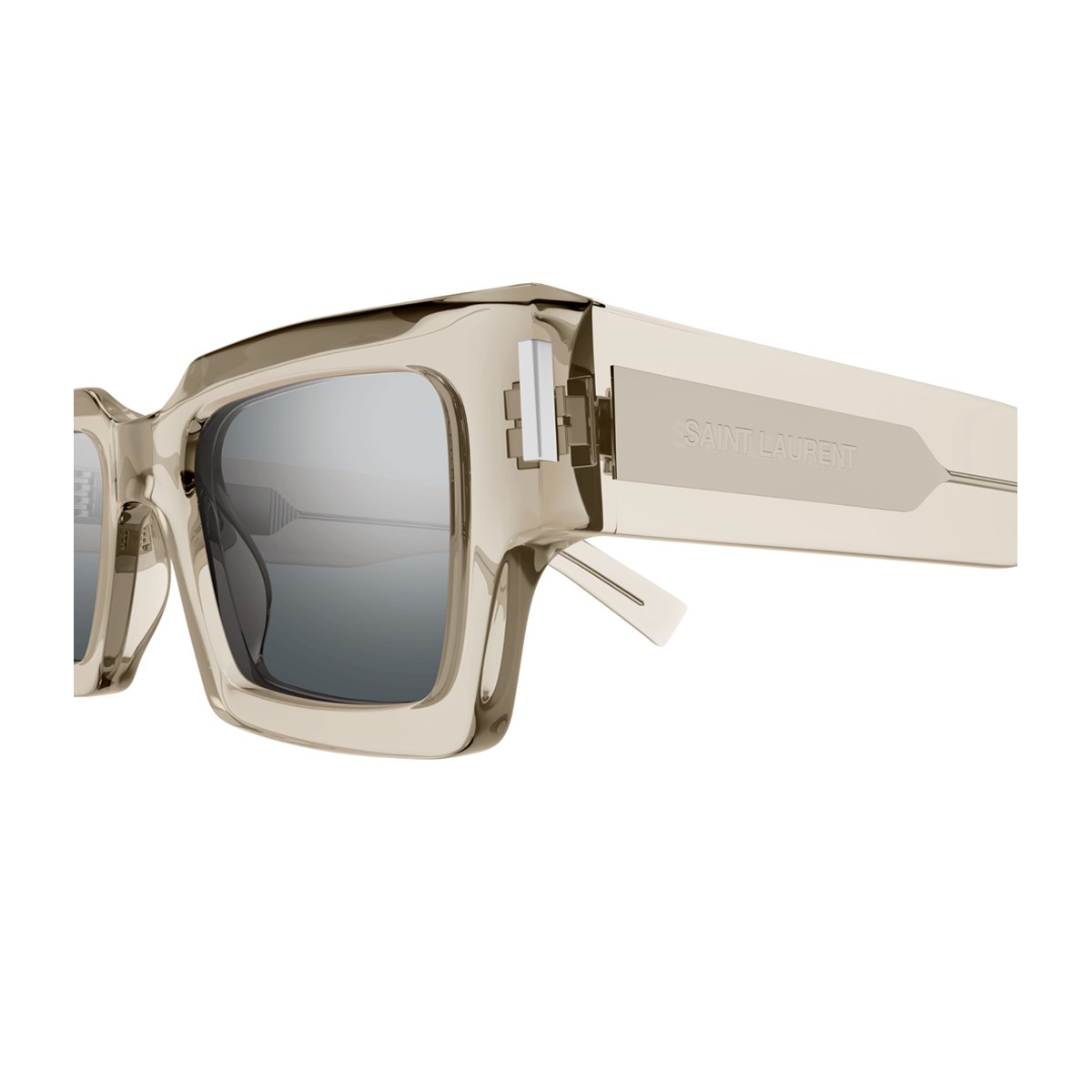 Il modello da sole SL 572 della Linea Corner Angle di Saint Laurent inaugura il nuovo concept stagionale Naked Wirecore, un’interpretazione moderna e sofisticata dell’occhiale da sole. La montatura rettangolare in acetato beige trasparente, dalle linee nette e decise, è abbinata a lenti in una raffinata tonalità di grigio con trattamento flashato, per un look contemporaneo e distintivo. Elemento iconico del design sono le aste, arricchite dall’incisione “corner angle” e realizzate in un materiale innovativo che lascia intravedere l’anima metallica, impreziosita dal logo Saint Laurent in elegante lettering.