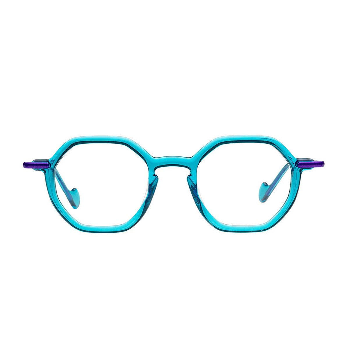 Il modello da vista Jelly di Matttew, brand belga fondato da Matthieu Duchêne, rinomato per le sue montature artigianali realizzate in Francia, è pensato per chi desidera unire stile, comfort ed originalità. La montatura in acetato turchese trasparente, impreziosita da dettagli viola, cattura lo sguardo grazie alla sua particolare forma geometrica che esalta i lineamenti con decisione ed eleganza. Le aste sottili in acciaio in viola metallizzato aggiungono leggerezza e stabilità, assicurando un comfort impeccabile.