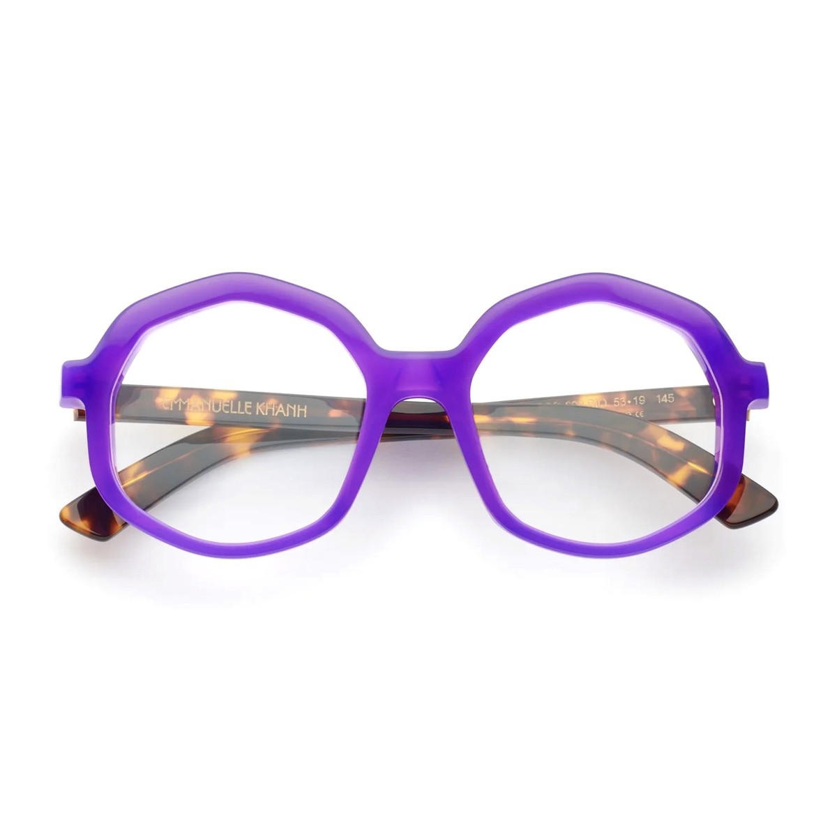 Le montature Emmanuelle Khanh incarnano l’eleganza parigina con design audaci e senza tempo, trasformando ogni sguardo in un’icona di stile. Il modello da vista Corso fonde armoniosamente eleganza architettonico e spirito parigino. La silhouette geometrica, dalle linee morbide e decise, è realizzata in pregiato acetato con frontale in un vibrante viola, lavorato artigianalmente in Francia. A completare il design, le aste effetto tartarugato impreziosite dal monogramma EK in metallo dorato sotto resina, dettaglio iconico della Maison.